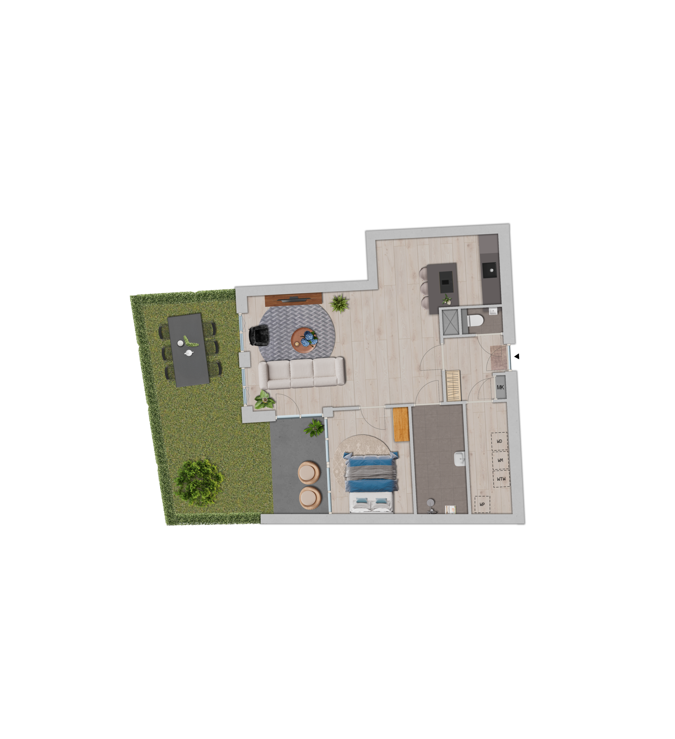 De woonkamer en keuken vormen samen een open leefruimte met zicht op groen. De zithoek ligt beschut, de keuken staat centraal. Via de deur loop je zó naar buiten: het terras van ca. 36 m² ligt op het zuiden en vangt de zon van ‘s ochtends tot laat in de middag. De ruime slaapkamer grenst aan de badkamer. Extra fijn: een grote berging en aparte wasruimte maken het praktisch én comfortabel.