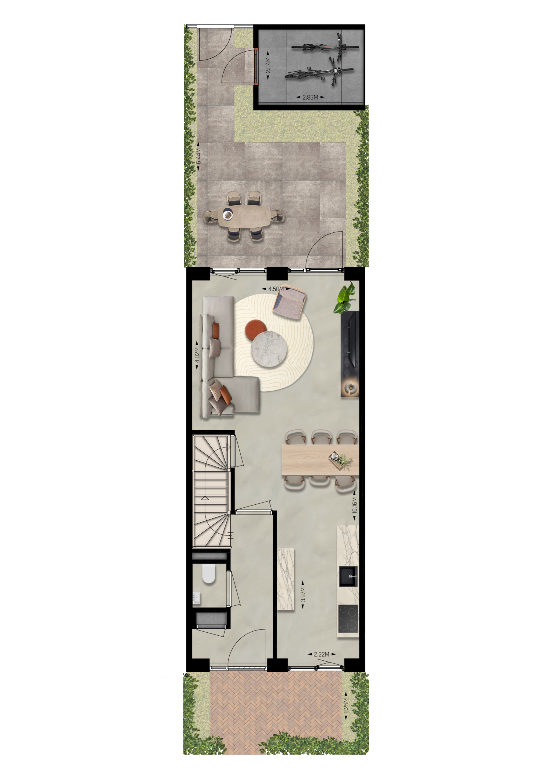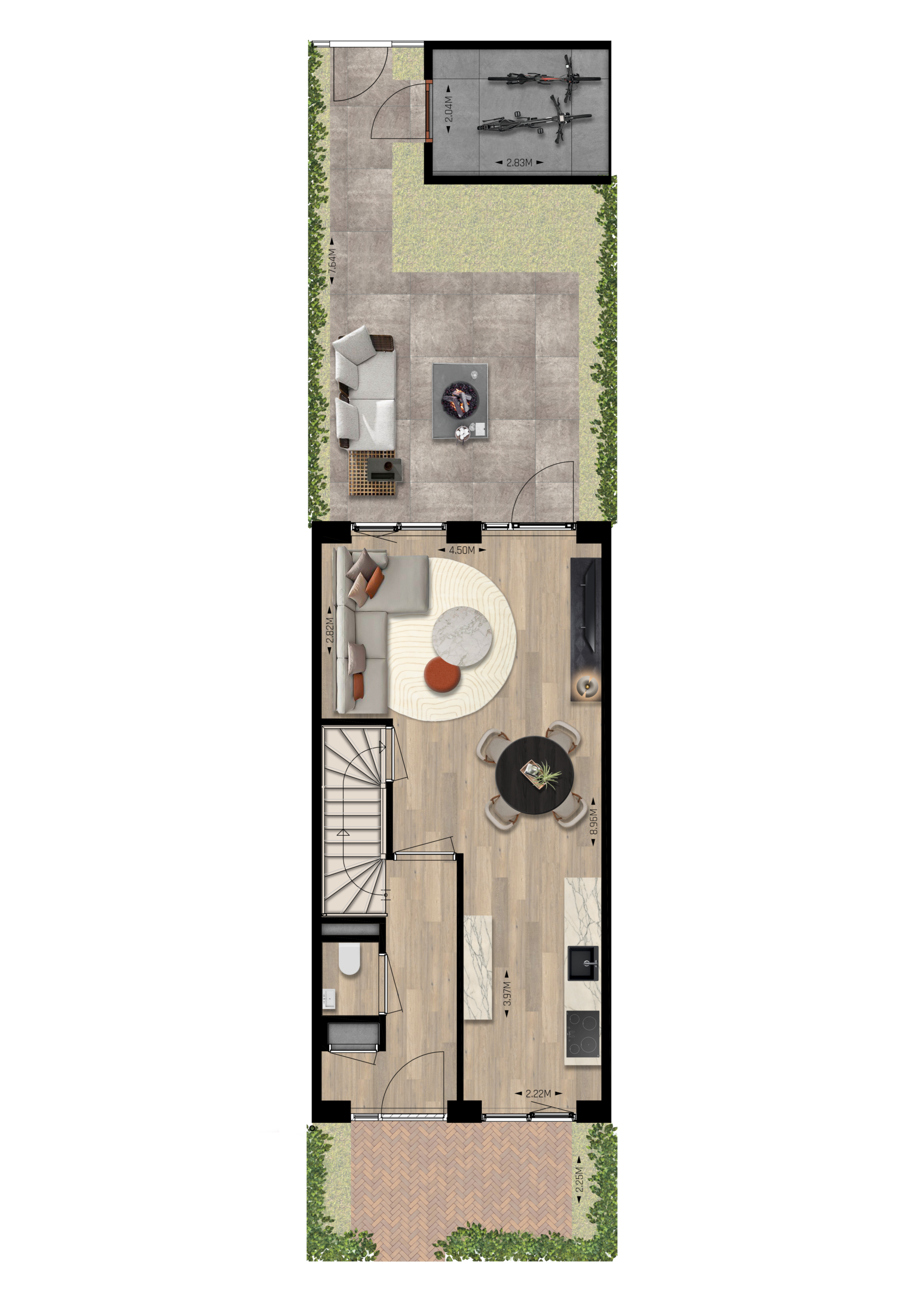 Je komt binnen via de hal met meterkast en toiletruimte. Vanuit hier loop je door naar de leefruimte, waar keuken en eethoek mooi in elkaar overlopen en er genoeg plek is voor een grote eettafel. Aan de tuinzijde ligt de woonkamer, met brede pui/deuren naar buiten: ideaal om binnen en buiten met elkaar te verbinden. In de achtertuin staat bovendien een handige (fietsen)berging.