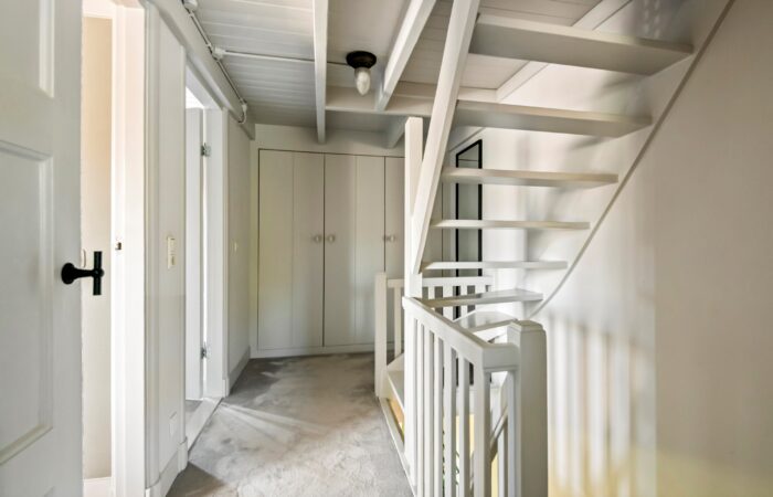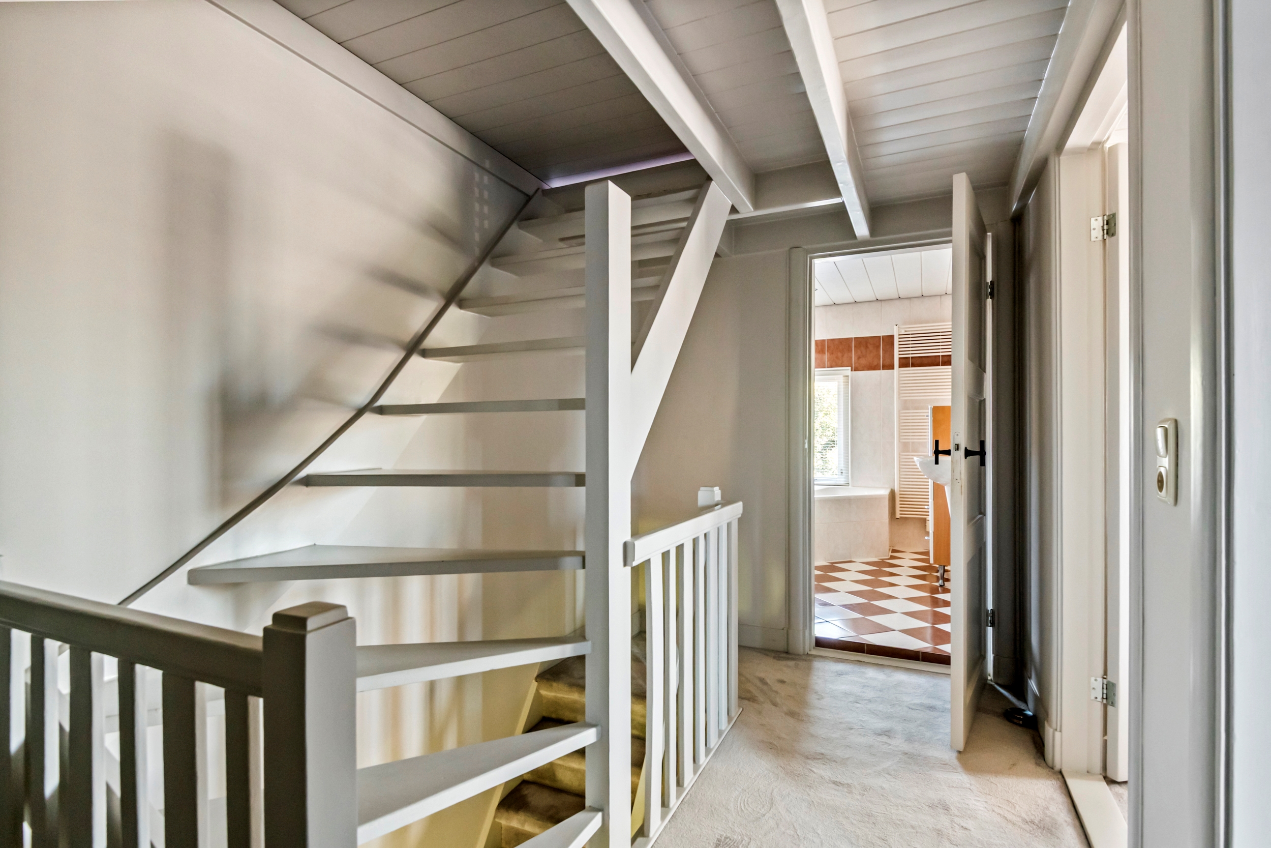 Op de eerste verdieping zijn zowel de slaapkamers als de overloop voorzien van vloerbedekking, wat bijdraagt aan een aangename en verzorgde sfeer. De royale ouderslaapkamer beschikt over een ingebouwde kledingkast achter het bed, slim ingedeeld in twee afzonderlijke compartimenten.