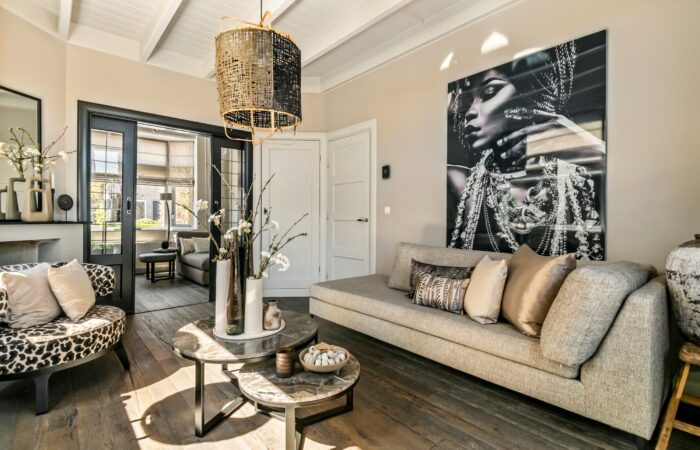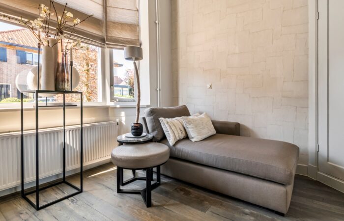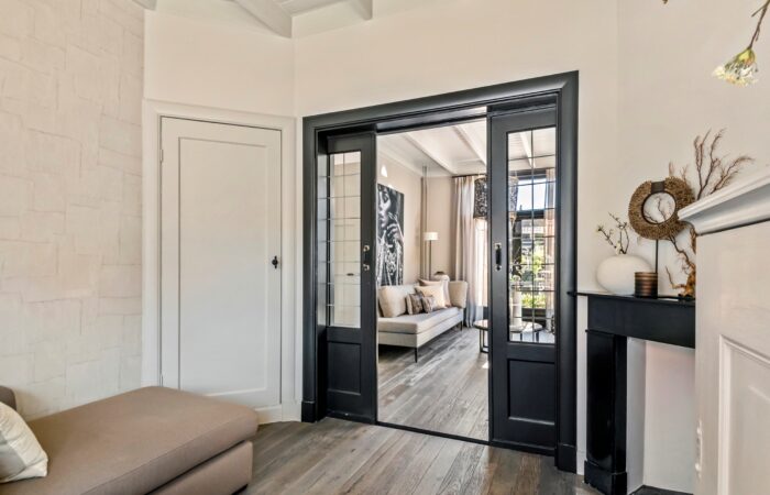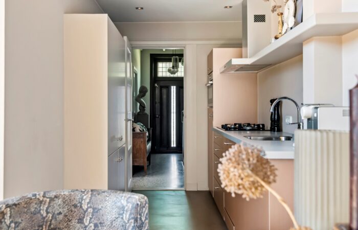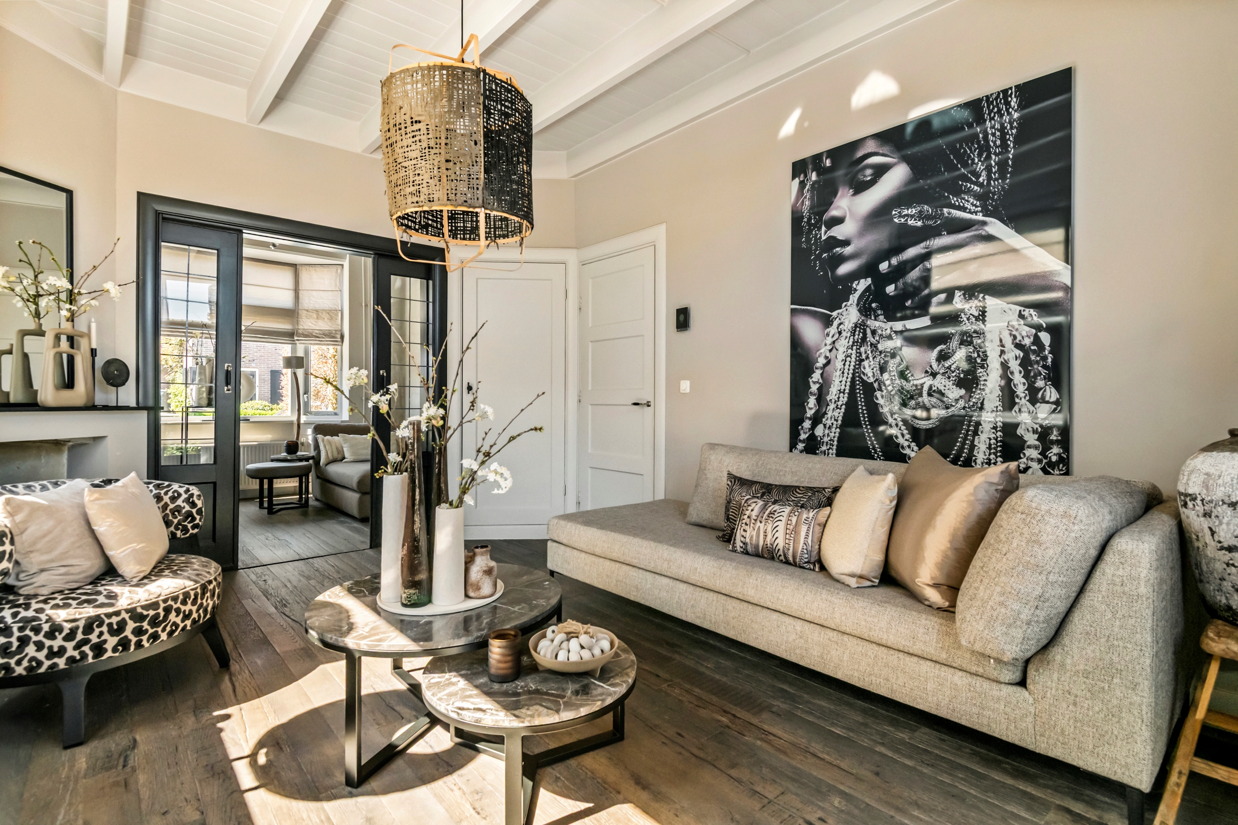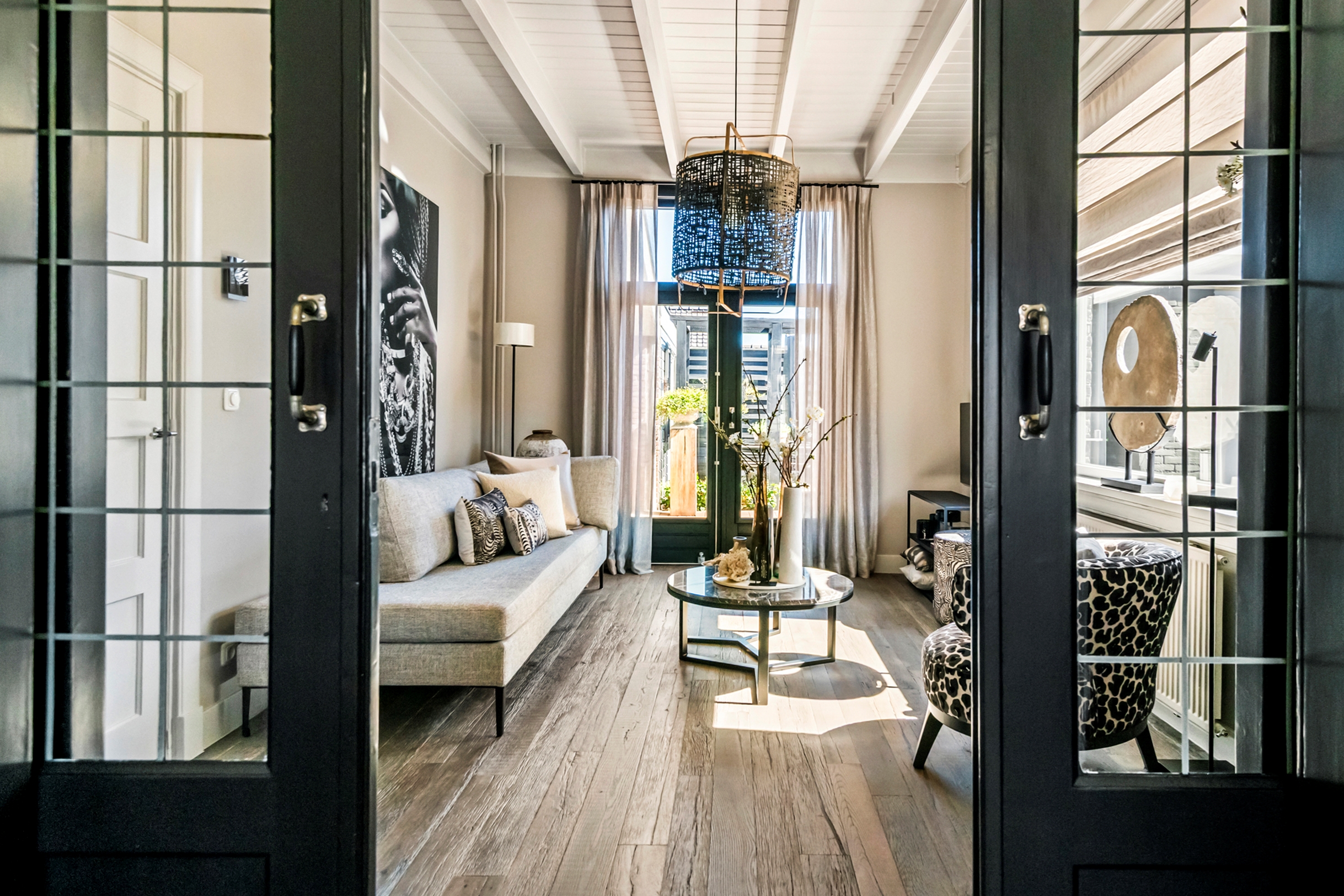 De woonkamer is opgedeeld in twee delen en wordt gescheiden door fraaie en suite deuren, wat zorgt voor een sfeervolle en klassieke indeling. De vloer in de woonkamer is bijzonder en zeldzaam; een type dat je niet vaak meer tegenkomt en dat perfect past bij het karakter van de woning. De voorkamer met erker is een heerlijke, knusse plek waar je je even kunt terugtrekken, bijvoorbeeld met een goed boek of een kop koffie. Aan de achterzijde bevindt zich het zitgedeelte met openslaande deuren naar de tuin, waardoor binnen en buiten op een prettige manier met elkaar in verbinding staan.