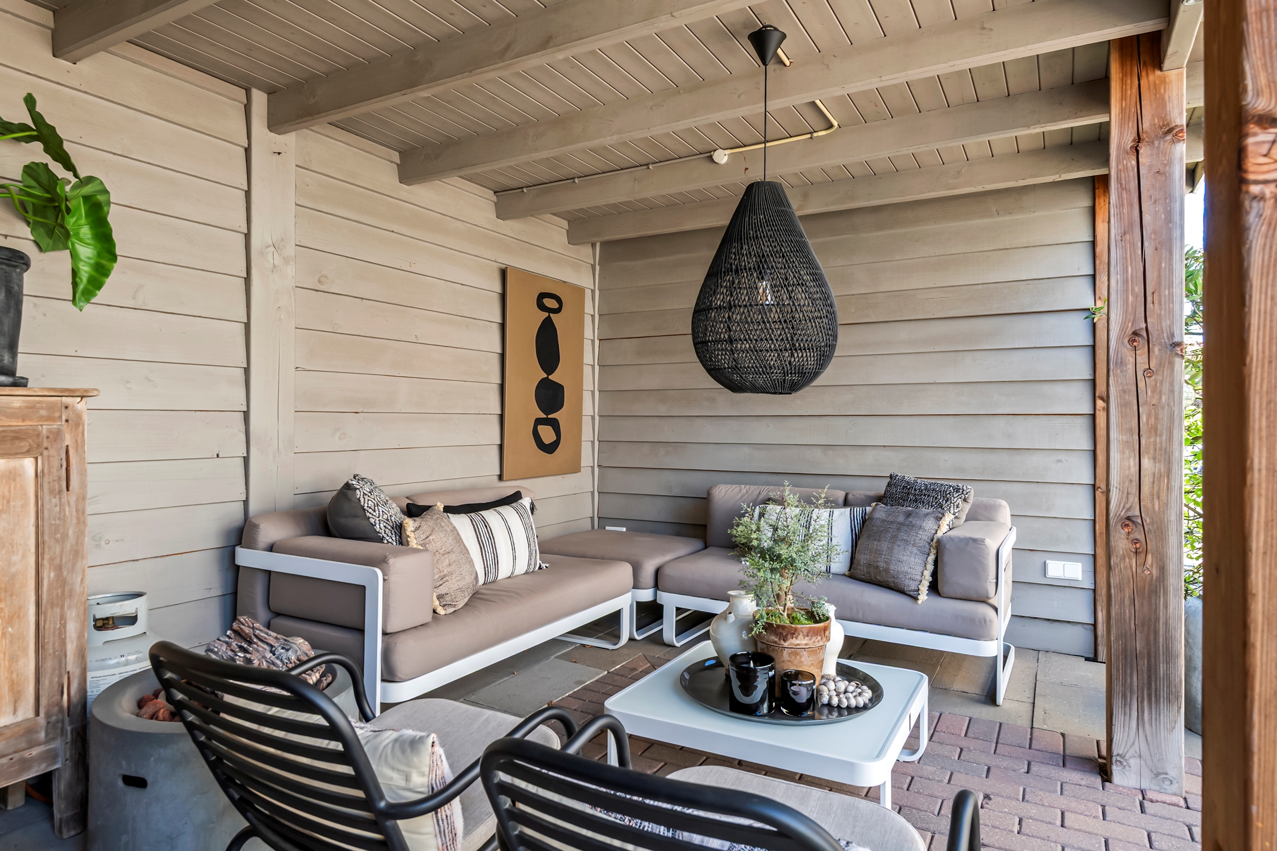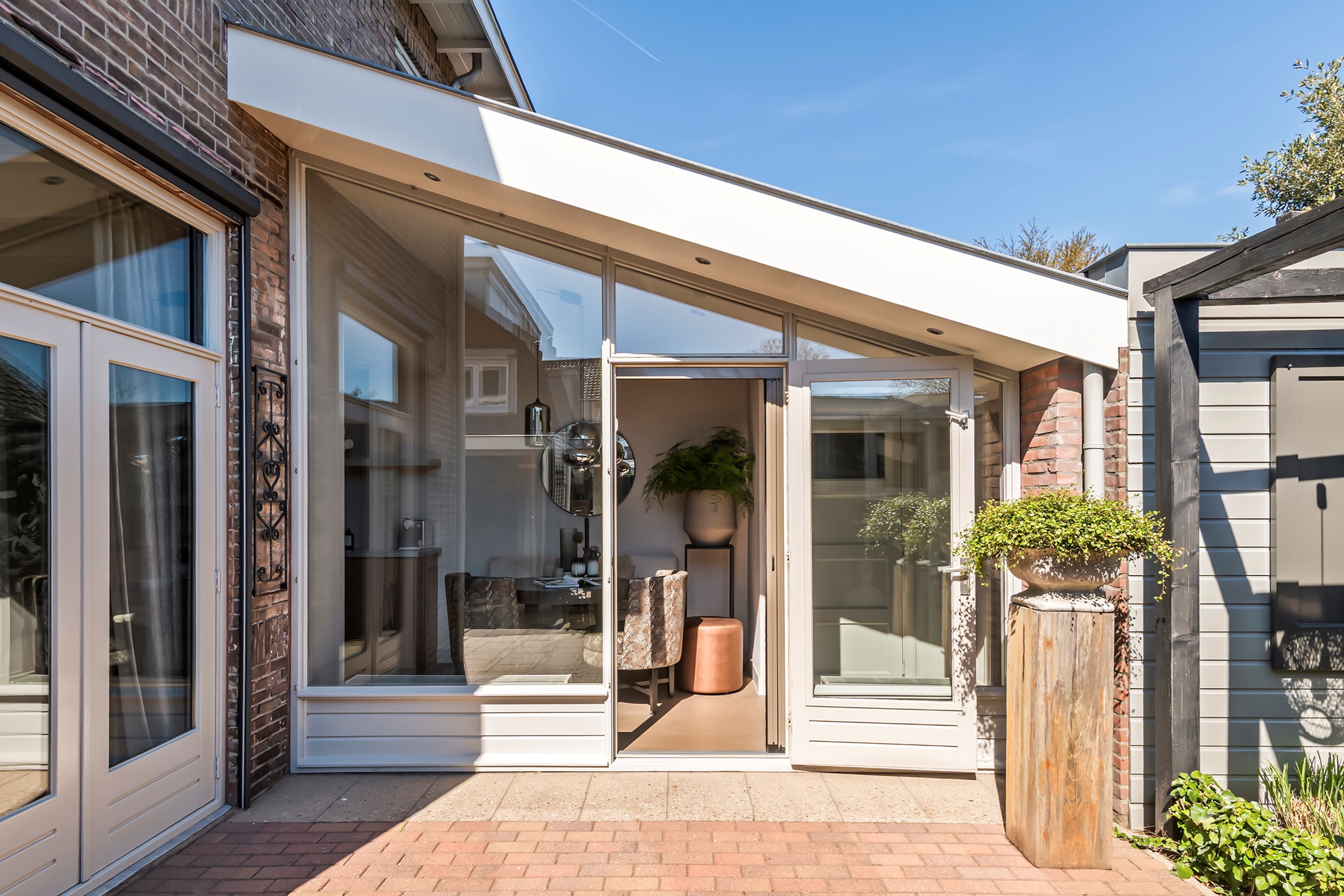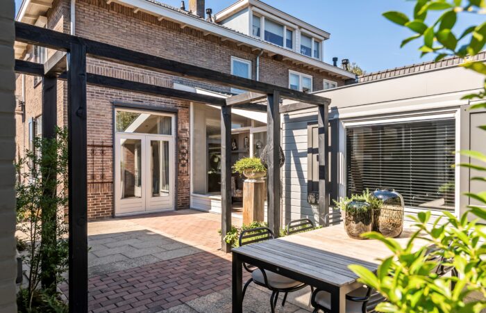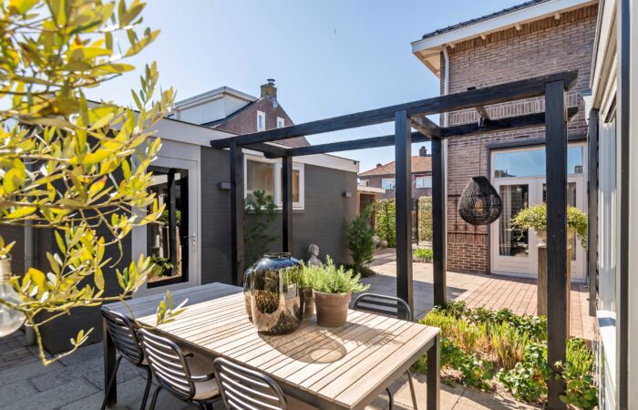 Ook in de zijtuin is het genieten: hier is een veranda geplaatst, waardoor je ook beschut en comfortabel buiten kunt zitten. Dit maakt de tuin niet alleen sfeervol, maar ook extra praktisch en veelzijdig in gebruik.