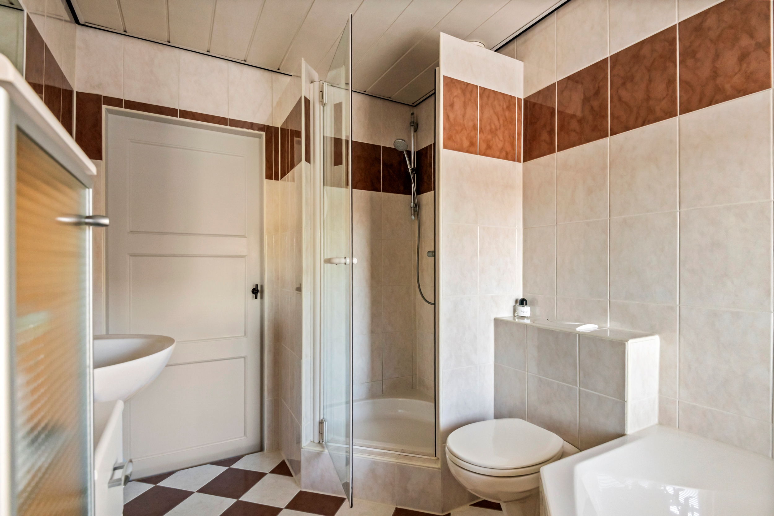De badkamer is functioneel en compleet ingericht met een douche, ligbad, toilet en wastafel.