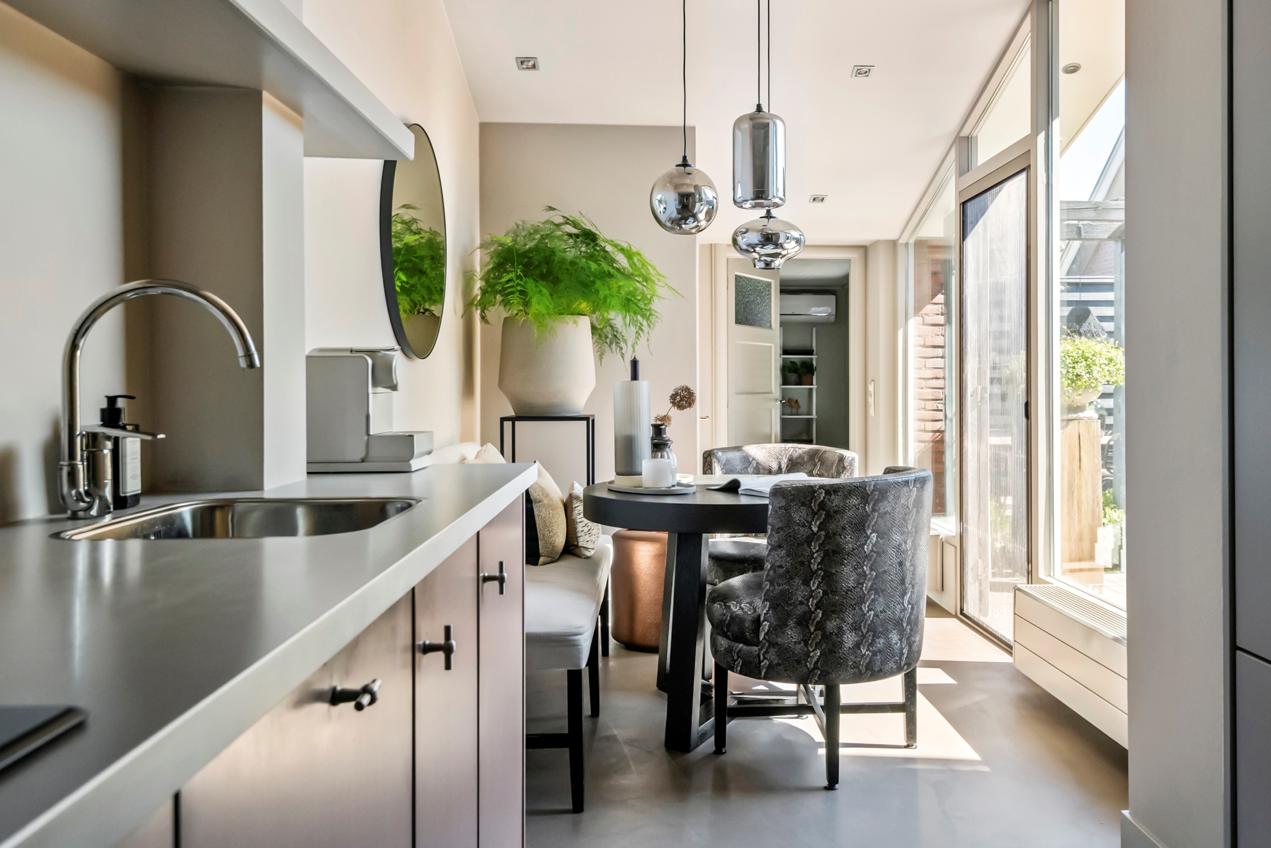 De woonkeuken is voorzien van een gietvloer en heeft een knusse opstelling. De keuken is uitgerust met een gaskookplaat, afzuigkap, koelkast en combi-oven. Daarnaast is hier de eettafel gesitueerd, waardoor een gezellige woonkeuken is ontstaan; een plek waar gekookt, gegeten en geleefd wordt. Dankzij de grote raampartij valt hier veel natuurlijk licht naar binnen, wat deze ruimte extra aangenaam maakt.