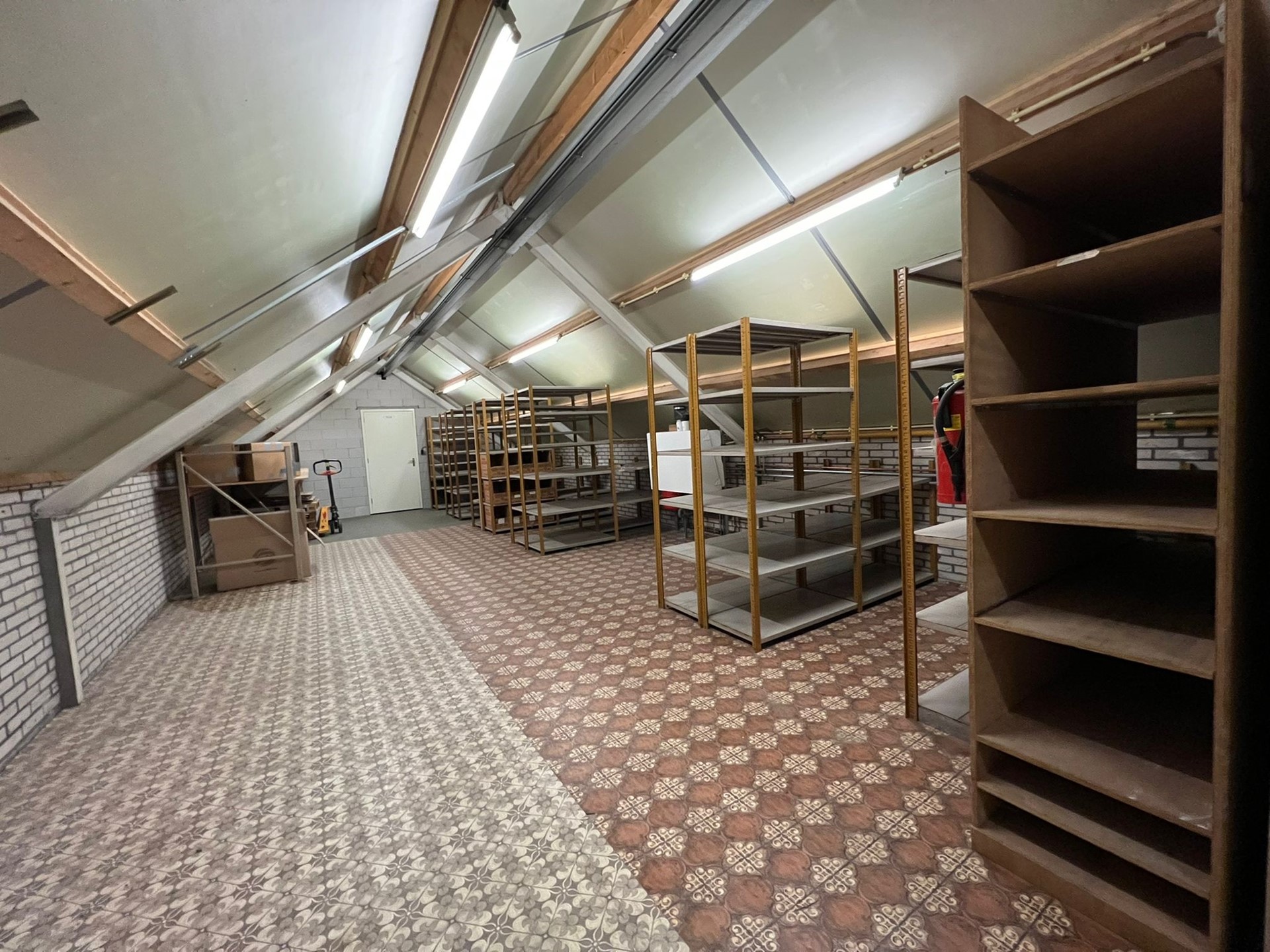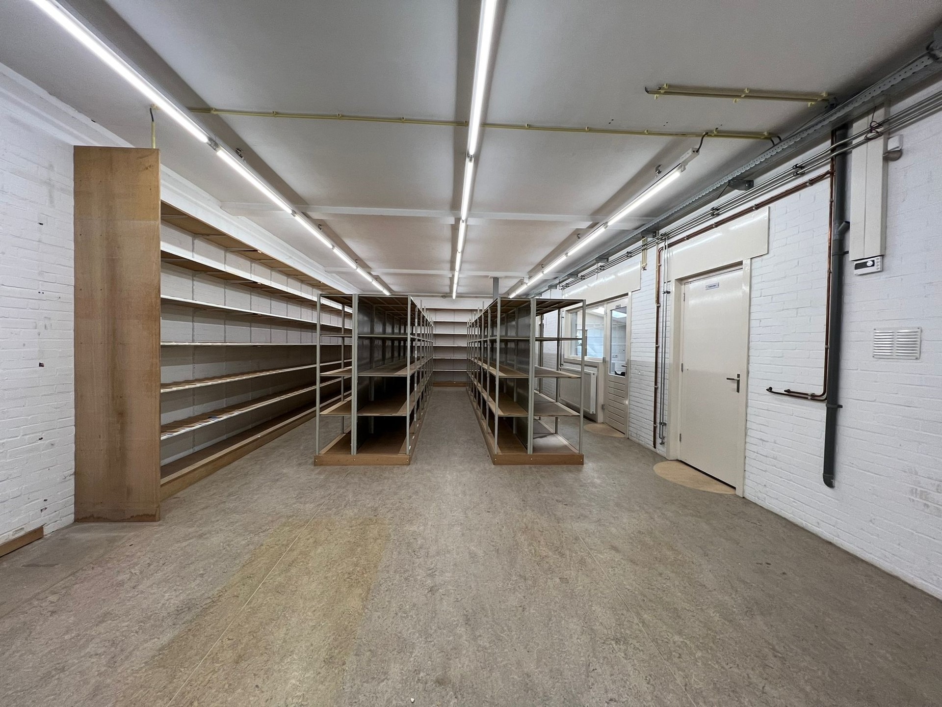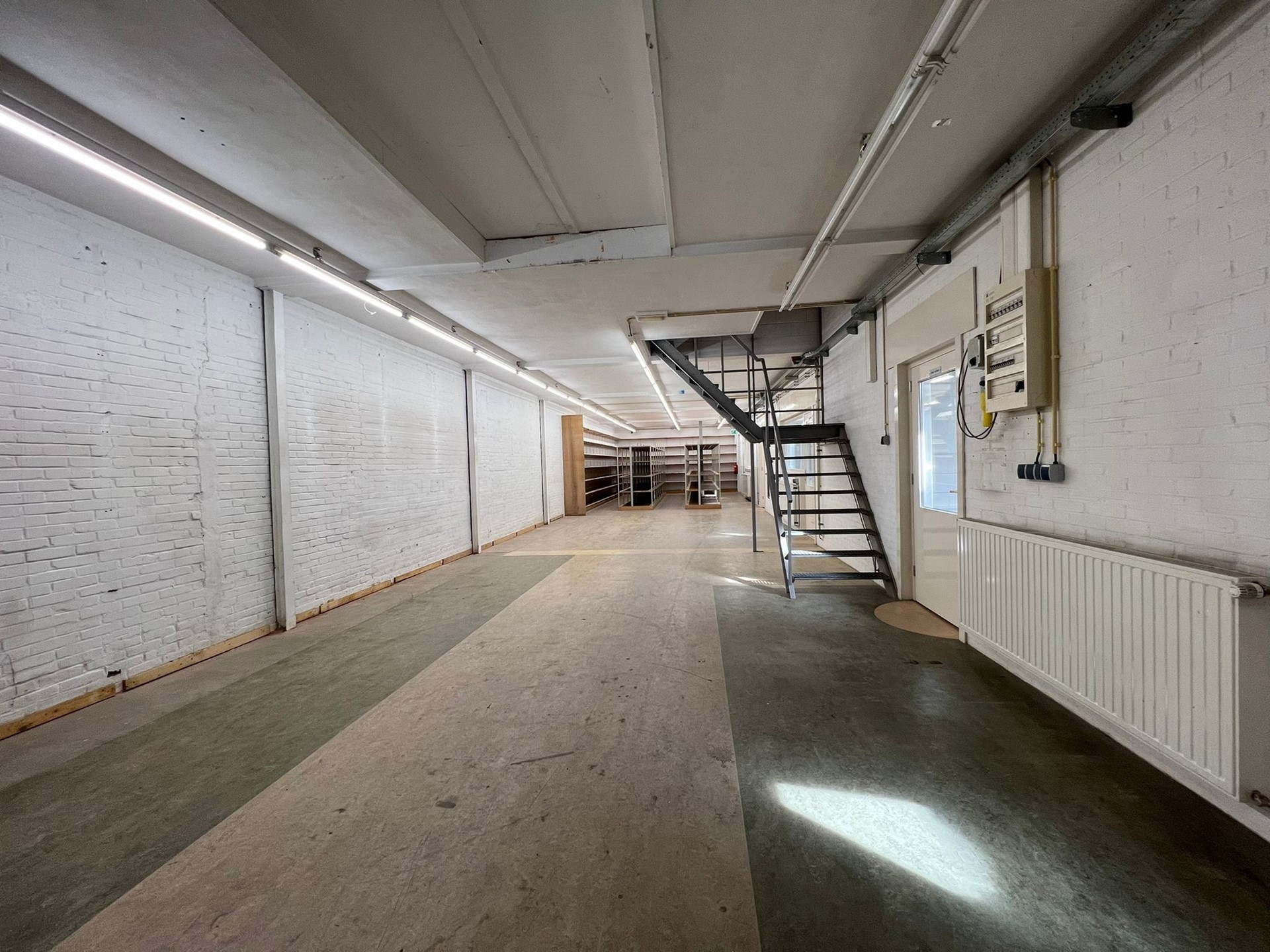 Via een overkapping komen wij bij of een sluis (ontvangst goederen met code voor leveranciers) of de entree waar de meterkast zich bevindt, werkplaats, bedrijfsruimte (magazijn) met vaste trap en liftsparing naar eerste verdieping, drie kantoorkamers, kantine en toiletruimte.