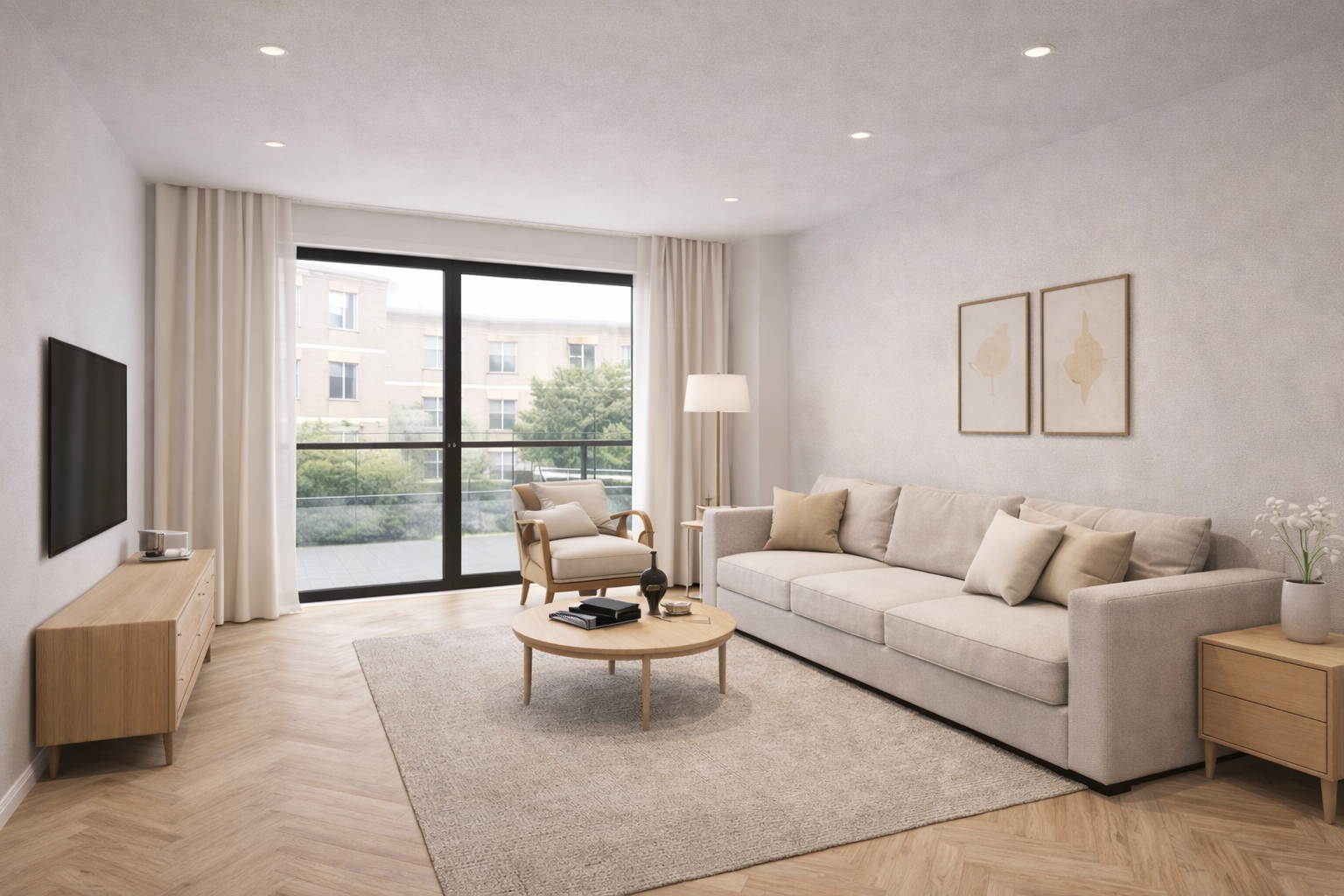De badkamer krijgt een eigentijdse inrichting met een inloopdouche en een dubbele wastafel met meubel, en er is een separate toiletruimte aanwezig. Een interne berging en technische ruimte zorgen voor praktische opbergmogelijkheden en een nette scheiding van techniek en leefruimte. Het gehele appartement wordt afgewerkt met een stijlvolle PVC visgraatvloer. Verhuizen en wonen maar!