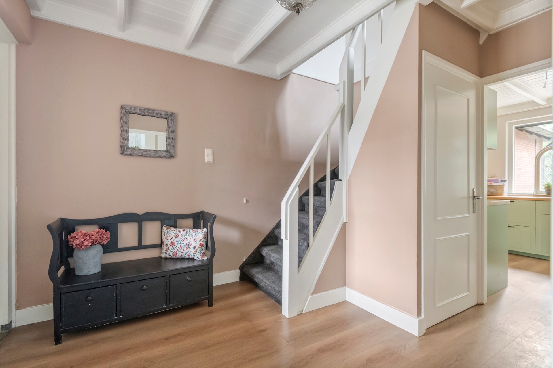 Via de entree van de woning kom je binnen in de ontvangsthal, die toegang biedt tot het toilet, de trapopgang naar de eerste verdieping en de keuken. Het toilet is strak afgewerkt en voorzien van een landelijke tegelvloer met warme tinten.