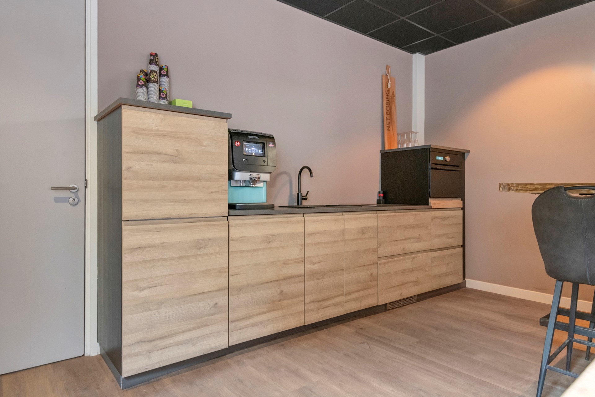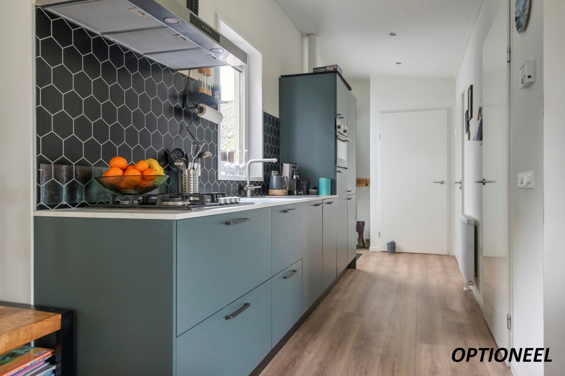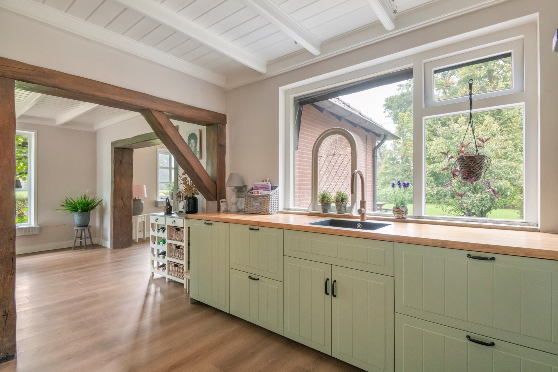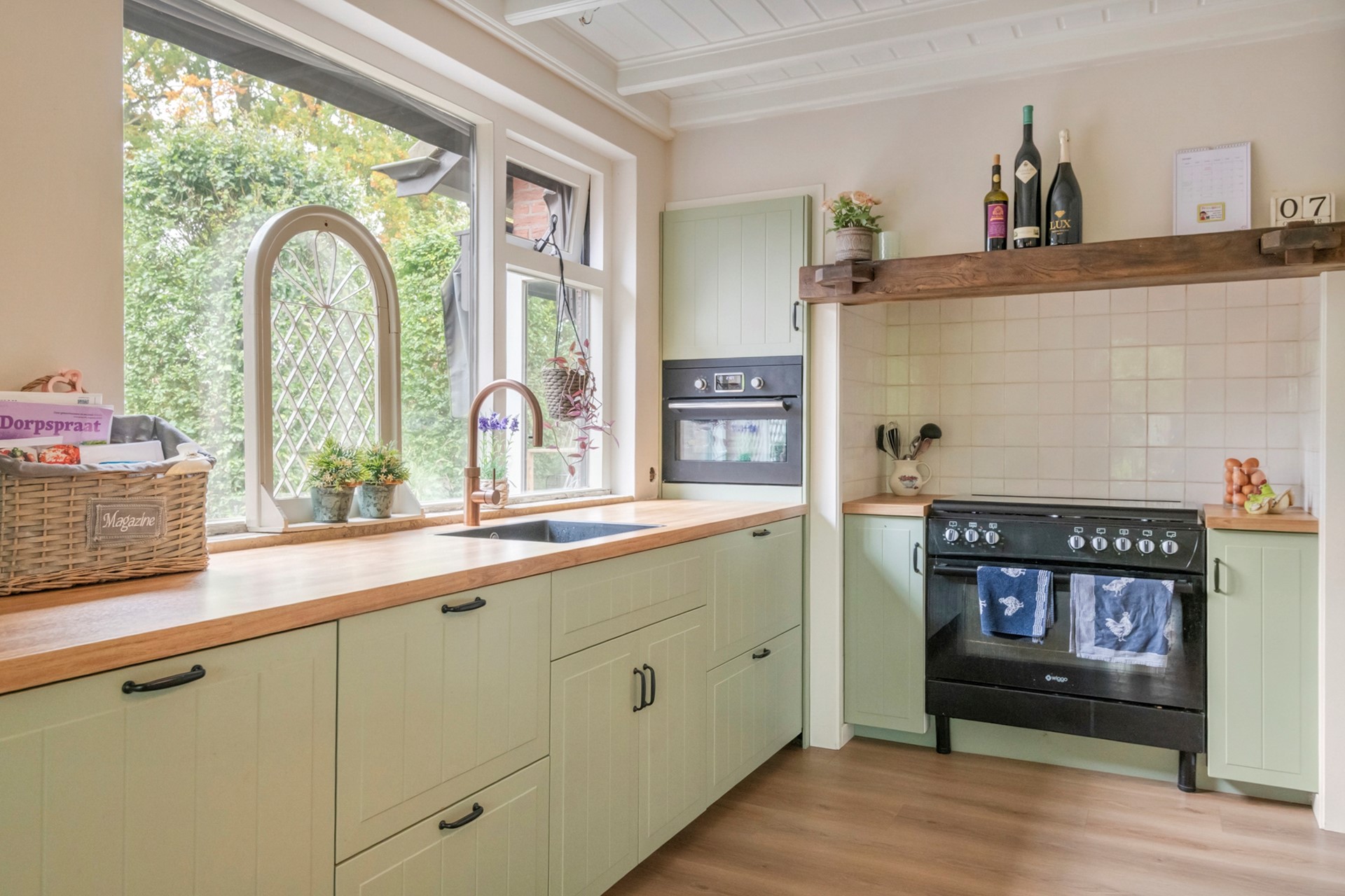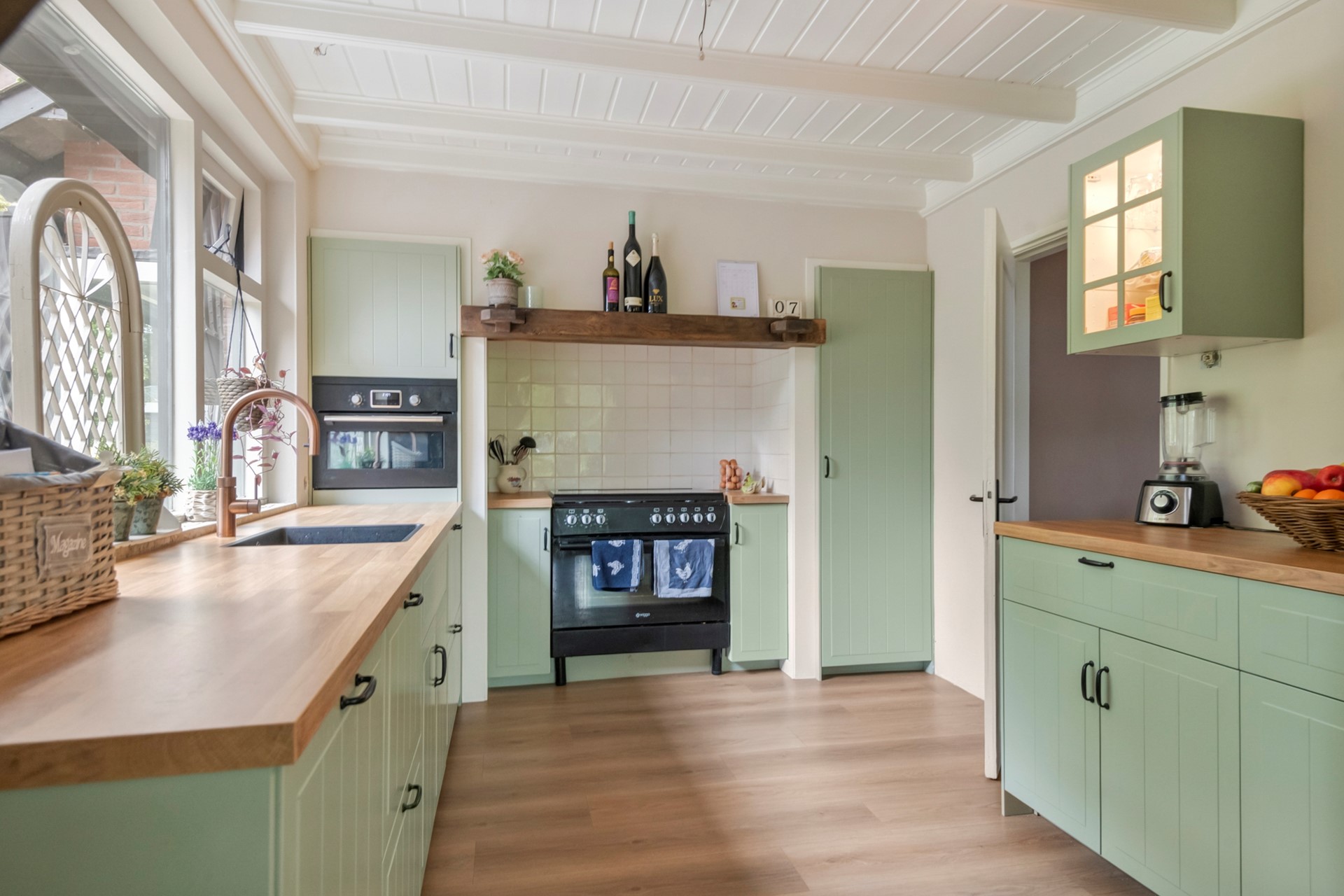De keuken is voorzien van groene kastfronten in combinatie met het houten werkblad geven het geheel een landelijke, maar eigentijdse uitstraling. De keuken is uitgerust met diverse inbouwapparatuur, waaronder een gasfornuis met oven, een combi-oven, een quooker-kraan, inbouwkoelkast en vaatwasser. Dankzij het raam dat uitkijkt op de tuin is er prettig veel lichtinval en een fijn zicht op het groen rondom de woning.