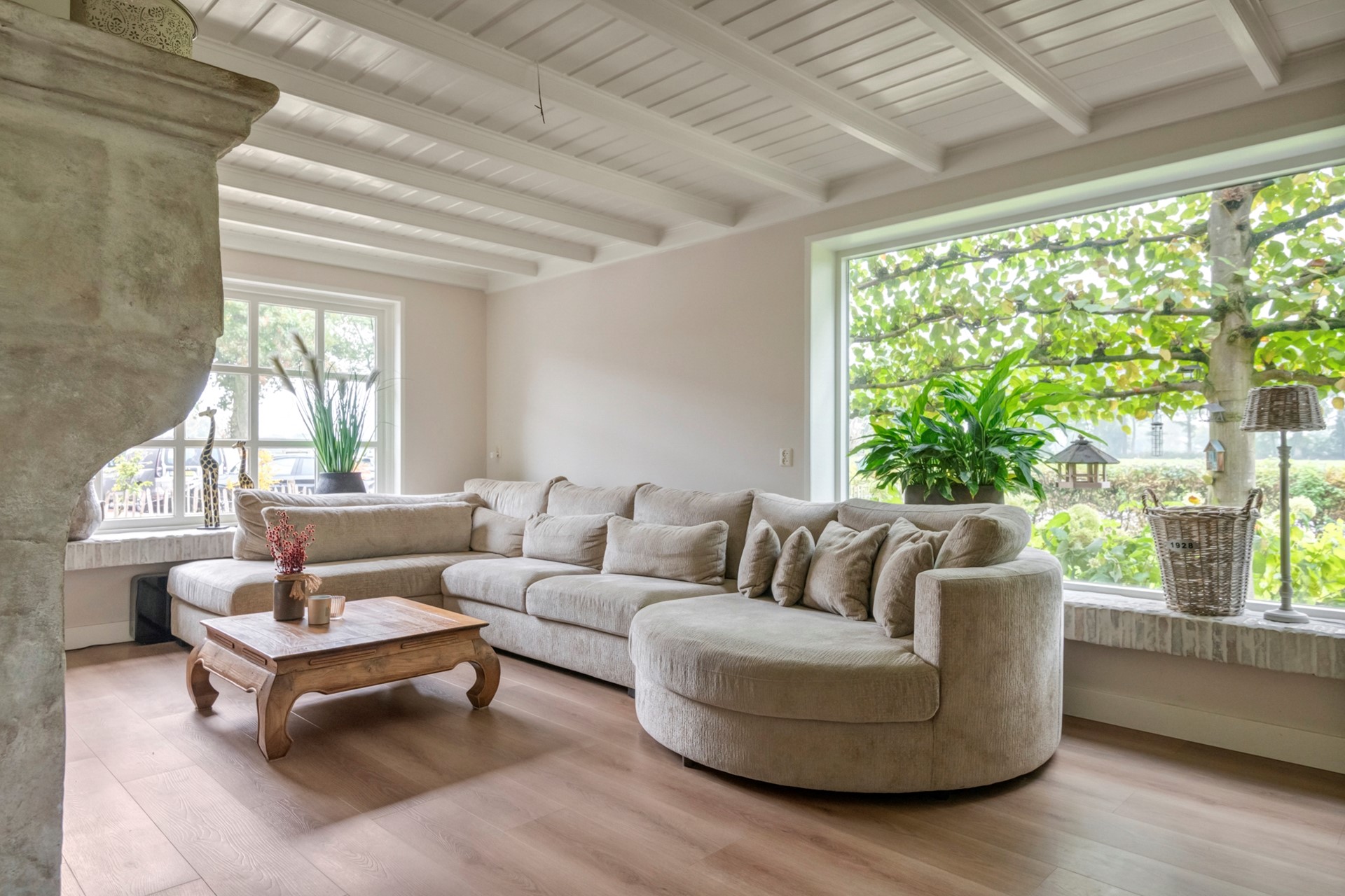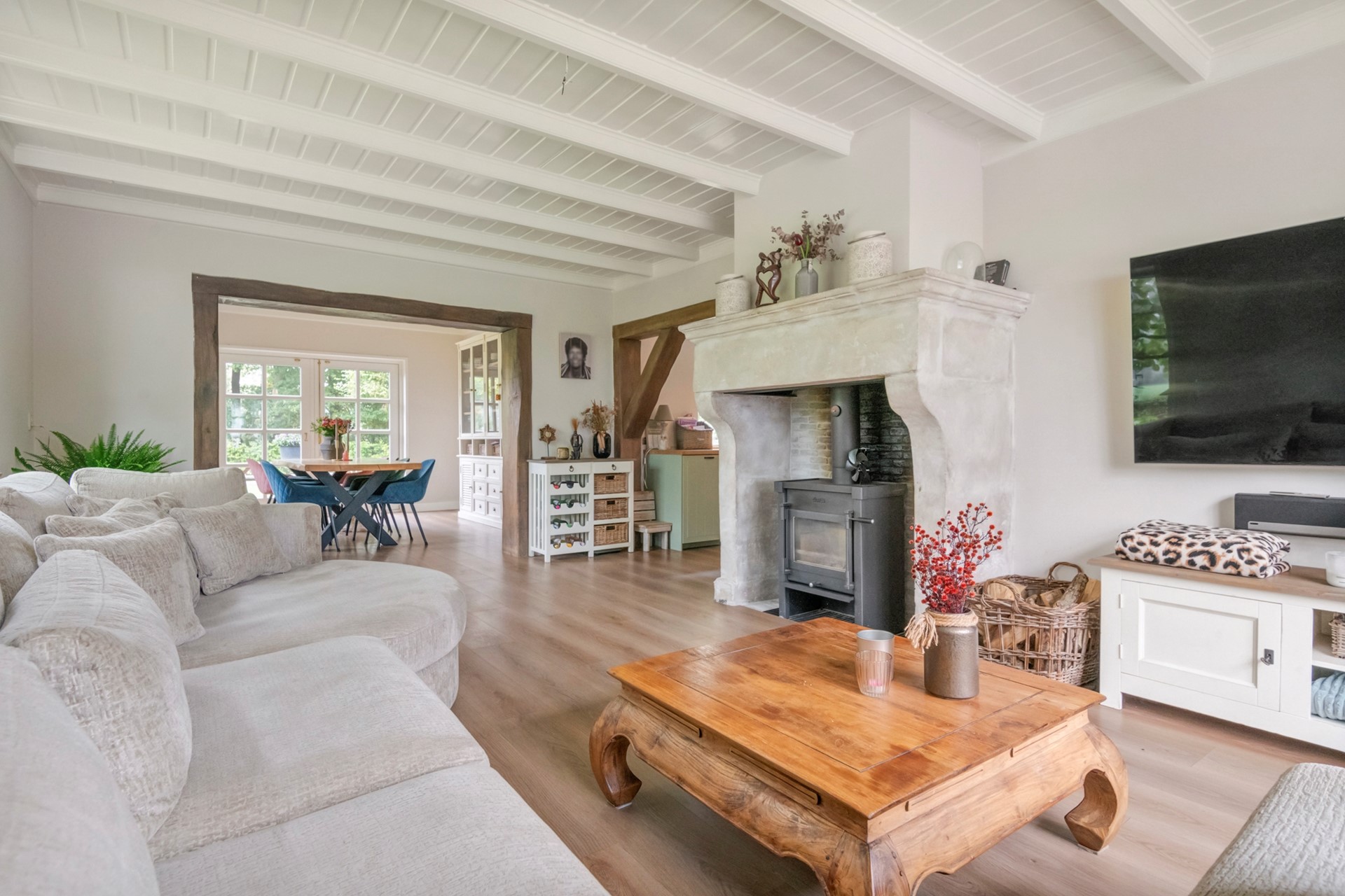 Tussen de keuken en woonkamer vormen de robuuste houten balken een sfeervolle doorkijk en zorgen ze voor een warme verbinding tussen de ruimtes. De woonkamer zelf is licht en uitnodigend, met een balkenplafond dat bijdraagt aan het landelijke karakter. De blikvanger is de prachtige schouw met houtkachel, die niet alleen sfeer maar ook behaaglijke warmte brengt op de koudere dagen.