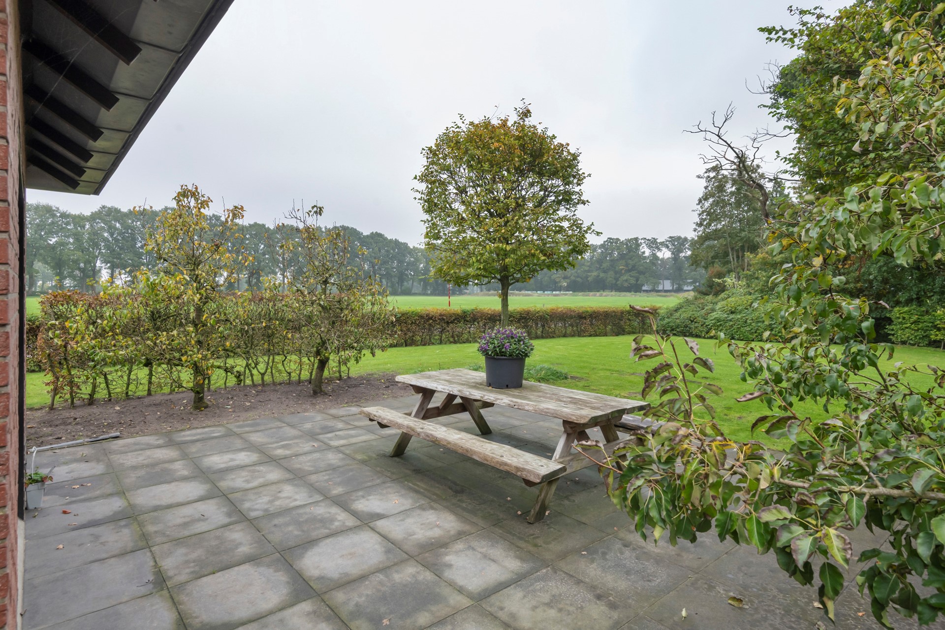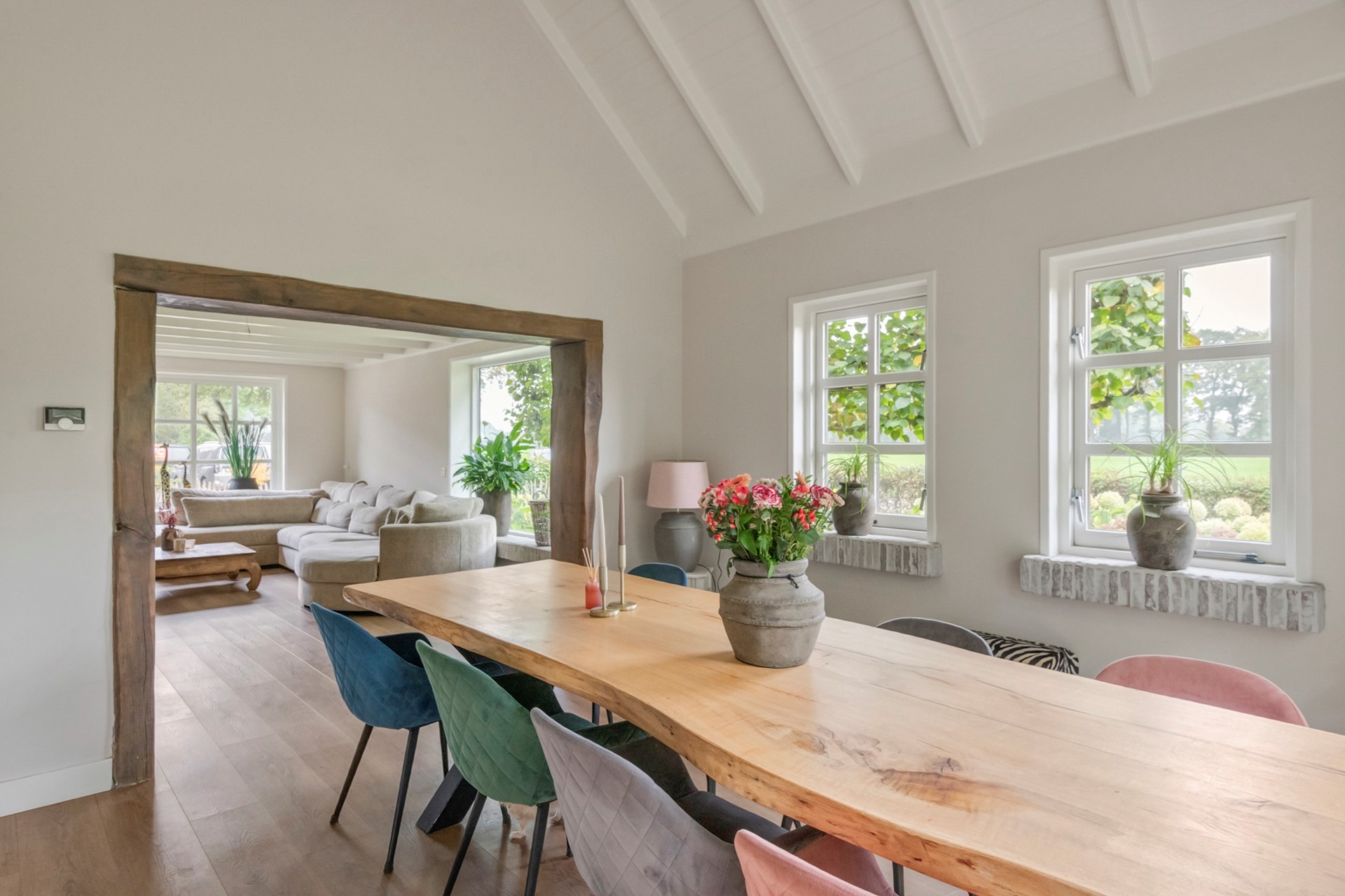 Rondom de woning ligt een fraai aangelegde tuin met volop groen, waar rust en ruimte centraal staan. De verschillende terrassen en open plekken nodigen uit om sfeervolle loungehoekjes te creëren, zodat je op elk moment van de dag kunt genieten van de zon of juist de schaduw. Overal om je heen kijk je uit over de uitgestrekte weilanden; een uitzicht dat nooit verveelt en zorgt voor een gevoel van vrijheid en ontspanning.