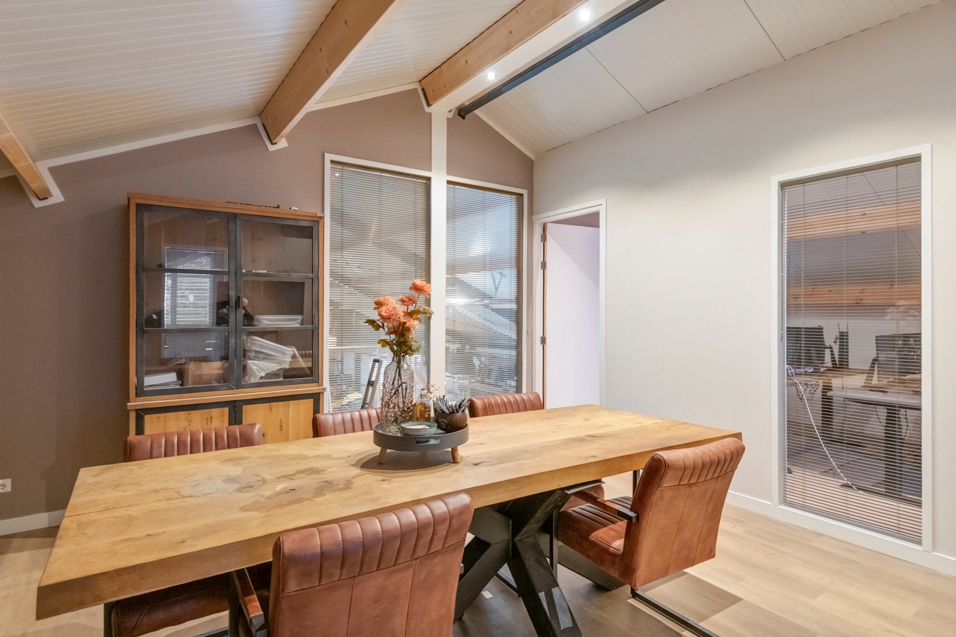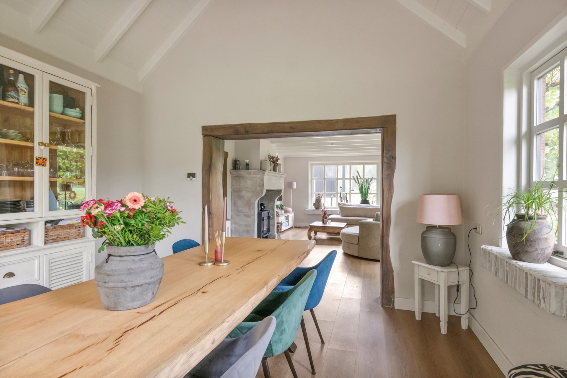 Aansluitend bevindt zich de ruime eetkamer. Hier valt direct de hoogte op: het hoge plafond geeft de ruimte een open en ruimtelijk gevoel. Via de openslaande deuren is er direct toegang tot de tuin.