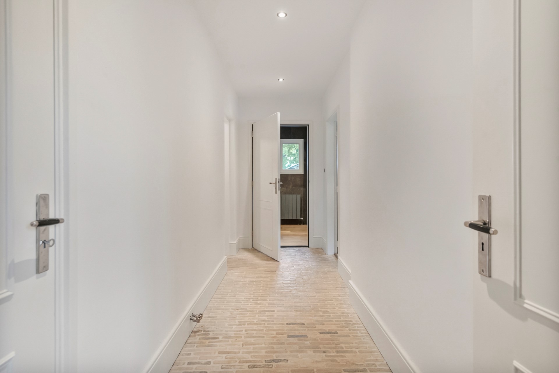 Vanuit de hal bereik je de gang die toegang biedt tot de slaapkamers, badkamer en technische ruimte. De gang is afgewerkt met lichte, landelijke tegels. Dankzij de aanwezigheid van drie slaapkamers en de badkamer op de begane grond is deze woning levensloopbestendig en geschikt voor iedere woonfase.