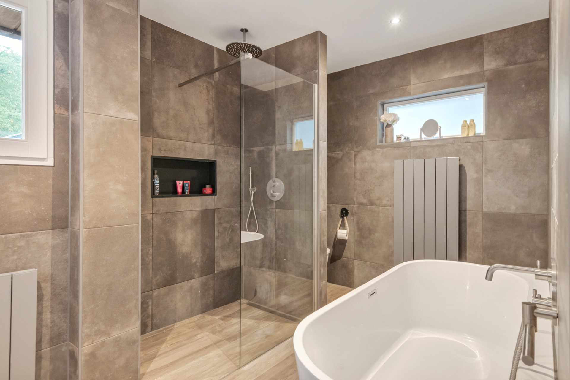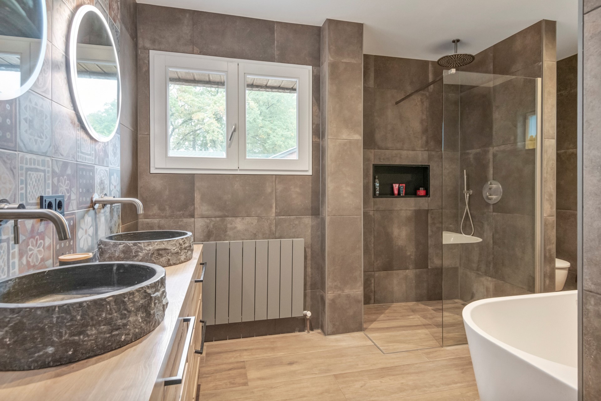 De badkamer is uitgerust met een ligbad, een ruime inloopdouche met stortdouche, een zwevend toilet en een stijlvol dubbel wastafelmeubel. De natuurlijke tinten en materialen geven de ruimte een warme, rustgevende uitstraling.