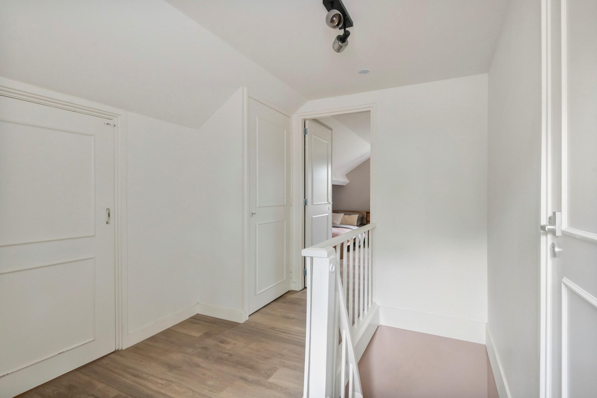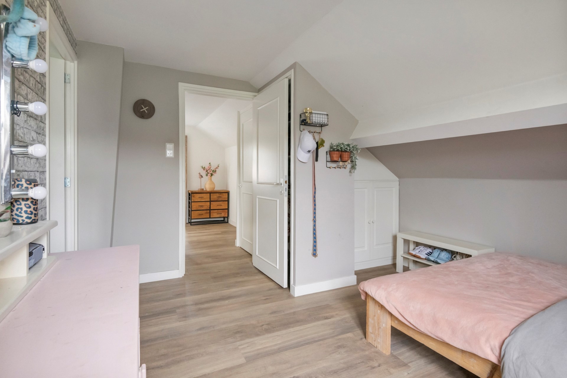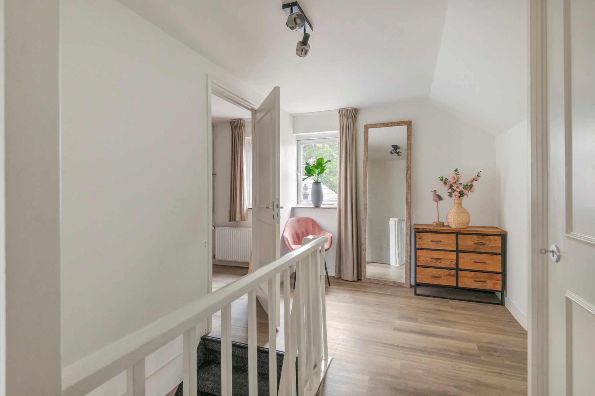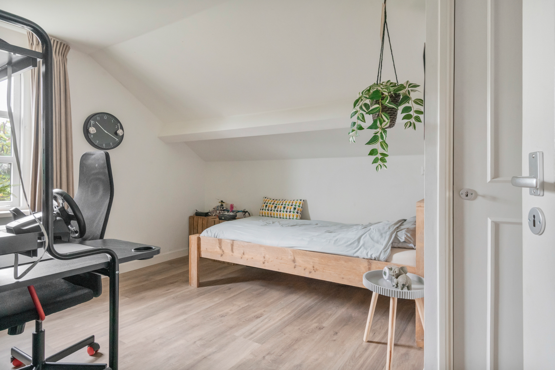 De eerste verdieping is te bereiken via een vaste trap. De gehele verdieping is voorzien van een pvc-vloer. Vanaf de ruime overloop zijn de slaapkamers en een bergzolder bereikbaar. Aan de voorzijde bevinden zich twee slaapkamers, beide voorzien van praktische inbouwkasten. Eén van deze kamers is bereikbaar via de ander, wat deze ruimte ook geschikt maakt als kleedkamer of extra werkplek. De derde slaapkamer ligt aan de achterzijde van de woning en biedt een fijn uitzicht over de omgeving. Vanaf de overloop is tevens toegang tot een royale bergzolder, ideaal voor extra opbergruimte.