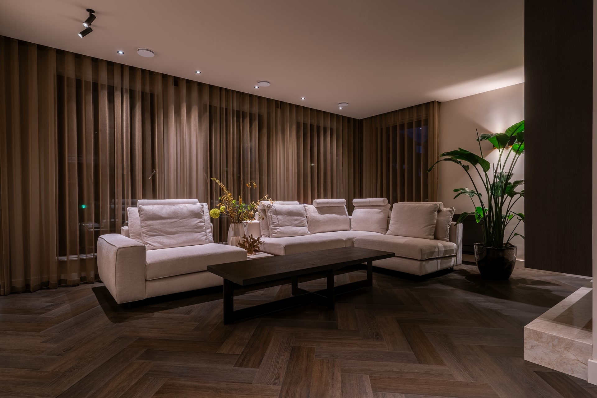 Wanneer u via de elegante, in brons uitgevoerde taatsdeuren de woonkamer binnenstapt, ontvouwt zich een prachtige leefruimte met een warme, luxe uitstraling. De grote raampartijen aan de voorzijde laten het daglicht rijkelijk binnenstromen en zorgen voor een prettige verbinding met buiten. Het op maat gemaakte wandmeubel vormt een stijlvol middelpunt in de ruimte en benadrukt het moderne karakter van de woning. Dankzij de royale opzet is er volop ruimte voor een comfortabele zithoek waar u heerlijk kunt ontspannen.