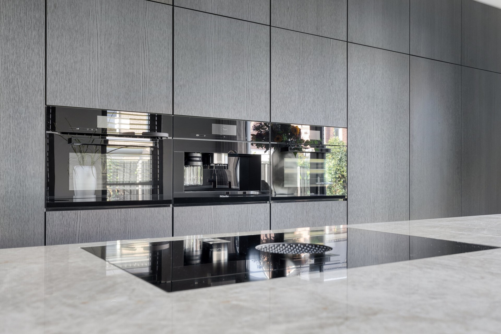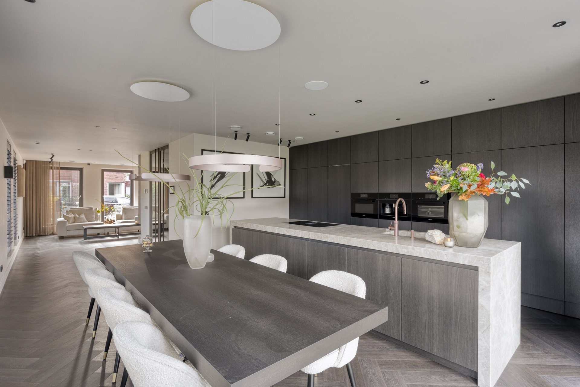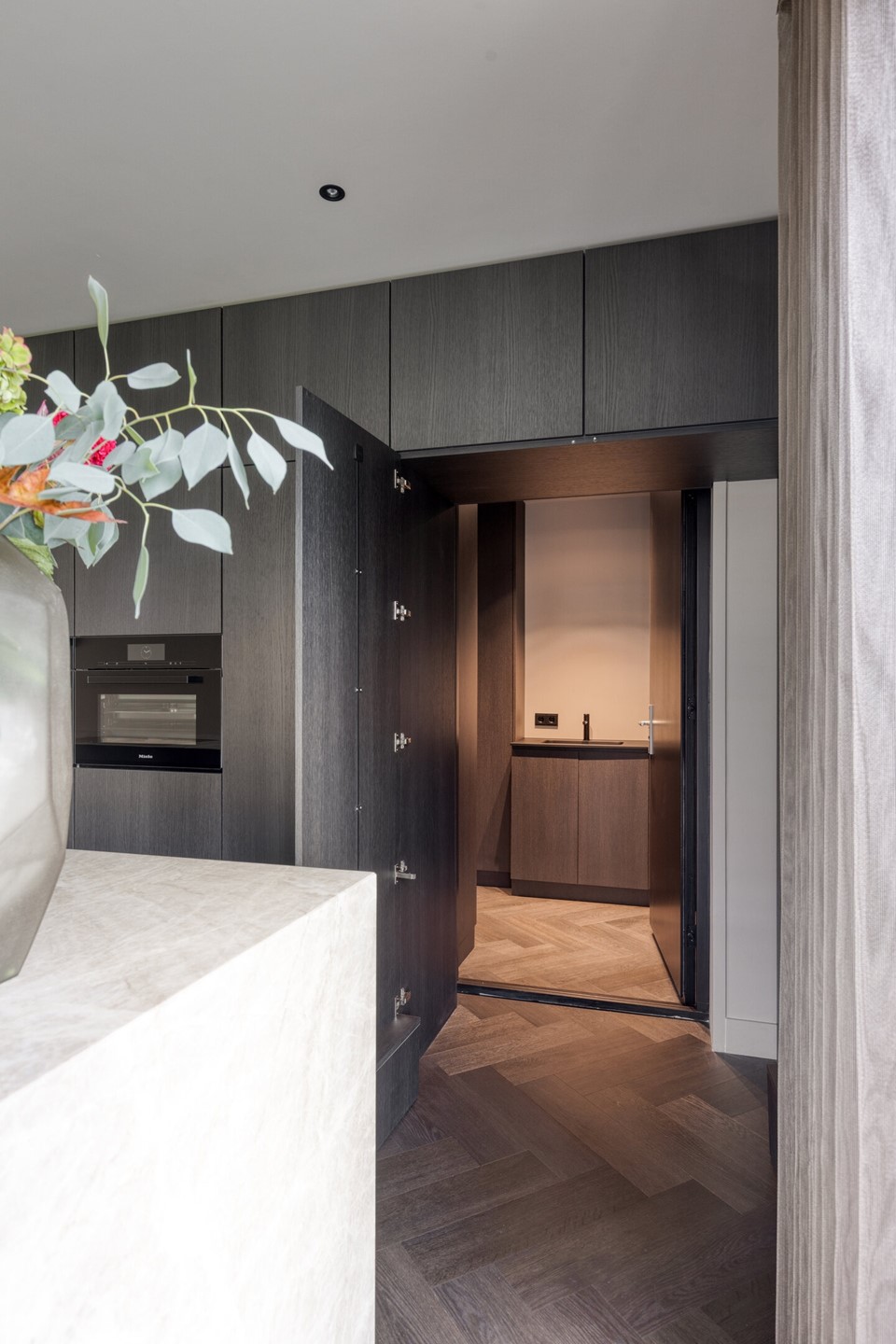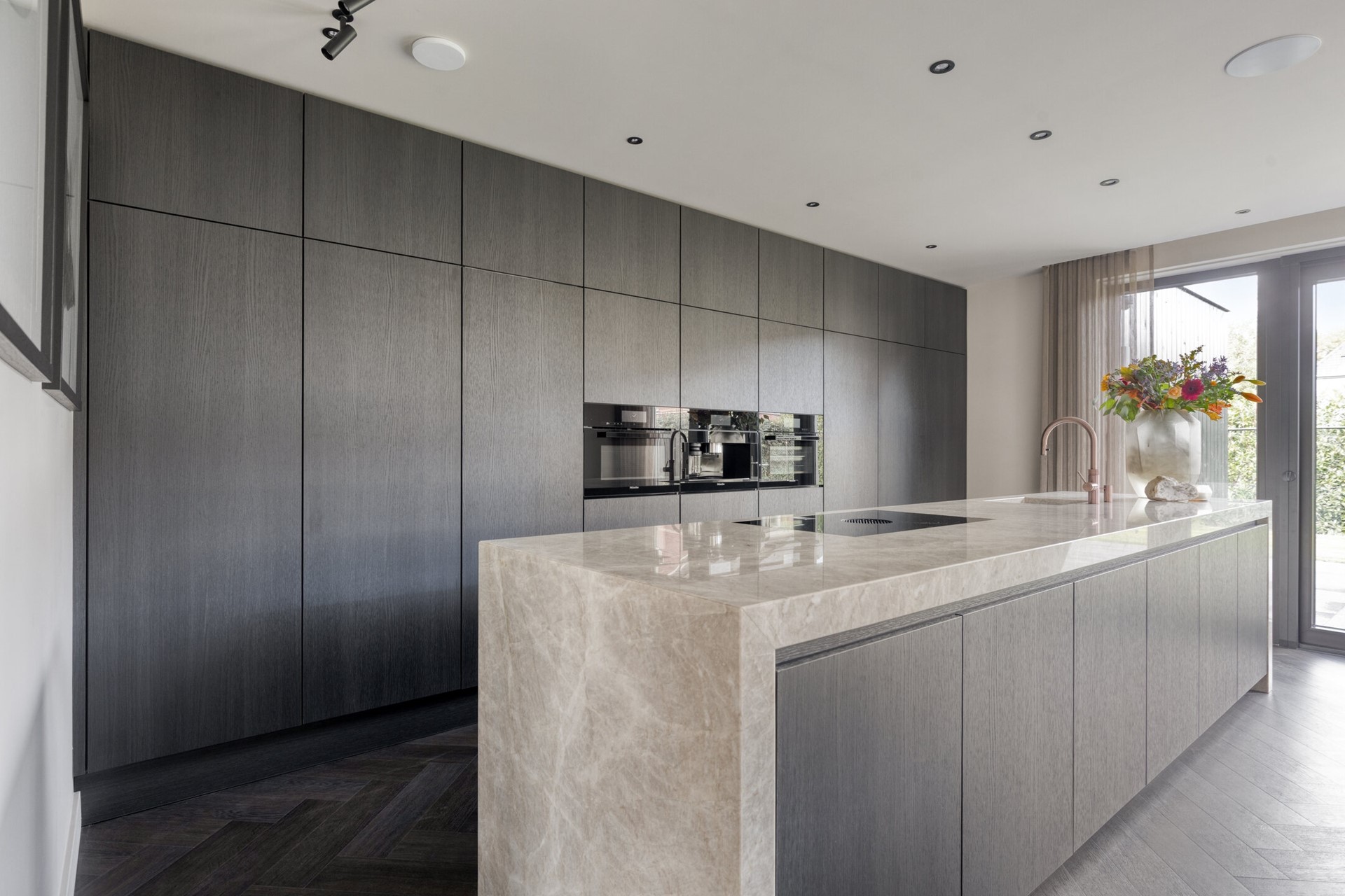 Aan de achterzijde bevindt zich de leefkeuken die zonder twijfel het hart van het huis vormt. Hier komt design samen met functionaliteit. Het werkblad van Pure Kwartsiet geeft de keuken een exclusieve uitstraling en voelt robuust én verfijnd tegelijk. Koken wordt hier een beleving dankzij de Bora inductiekookplaat met geïntegreerde afzuiging en de overige inbouwapparatuur zoals de ovens, inbouw koffiemachine, grote koelkast, vriezer en vaatwasser zijn van de bekende merken Miele en Siemens. Alles is tot in detail op elkaar afgestemd. De royale opstelling biedt meer dan voldoende ruimte voor een grote eettafel, waar lange avonden met familie en vrienden vanzelfsprekend worden. Via de openslaande deuren loopt u zo het terras op, waardoor binnen en buiten op natuurlijke wijze in elkaar overvloeien.