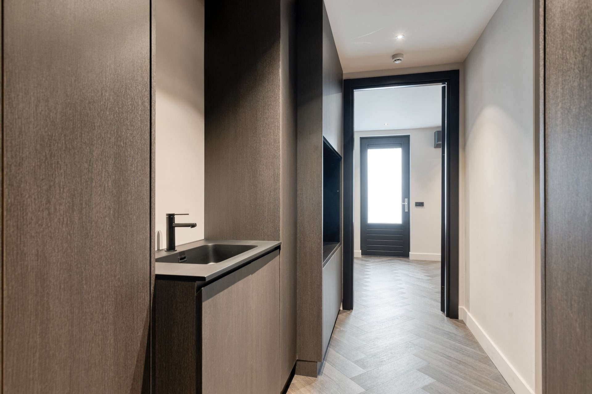 Subtiel weggewerkt achter een strakke deur in de rechte keukenstelling bevindt zich de praktische bijkeuken met extra bergruimte en aansluitingen voor huishoudelijke apparatuur. Aansluitend ligt een extra kamer die zich moeiteloos laat aanpassen aan uw wensen: een rustige thuiswerkplek, een hobbyruimte of een fijne speelkamer. Juist deze flexibiliteit maakt de woning niet alleen stijlvol, maar ook bijzonder praktisch.