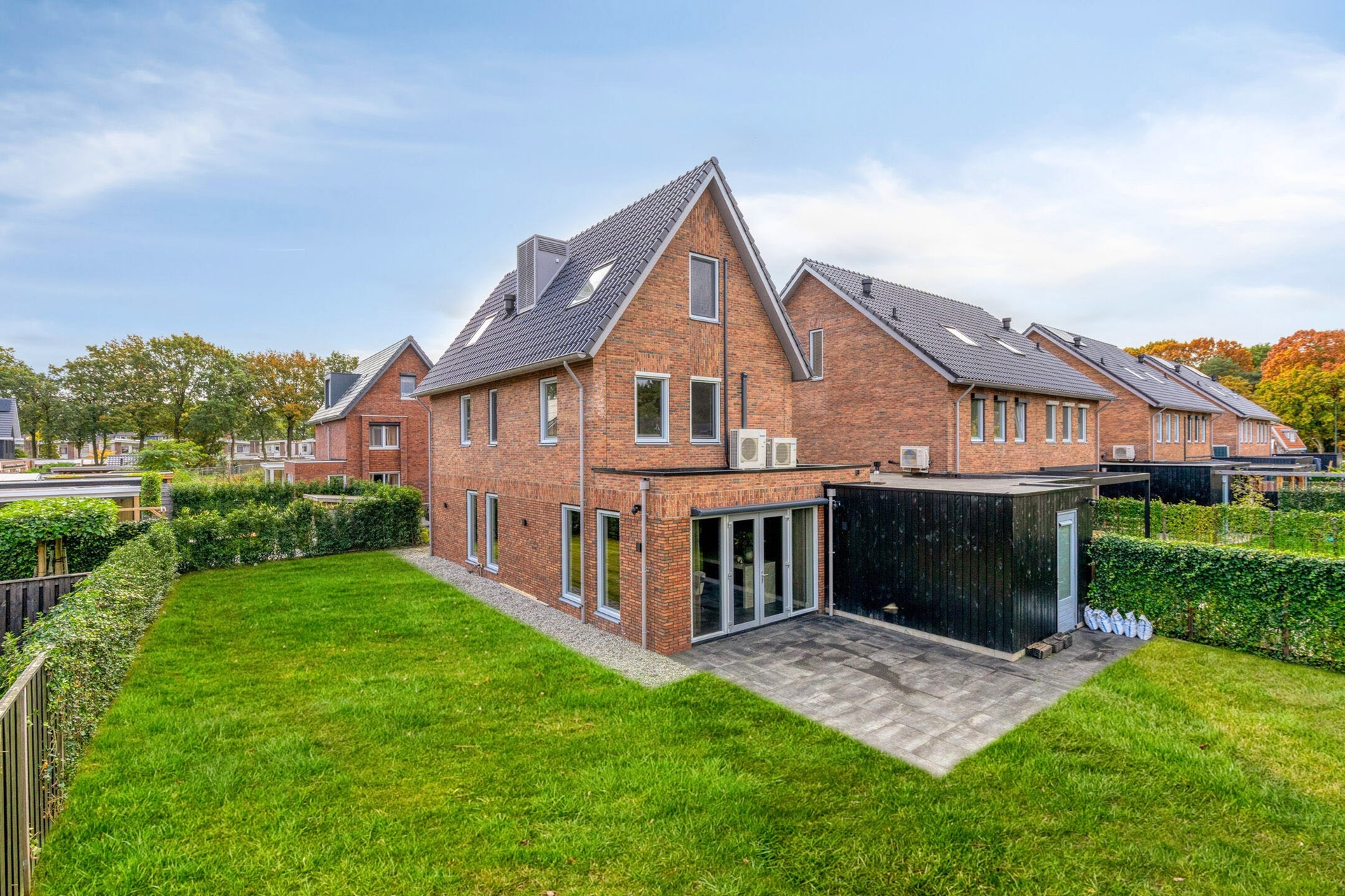 Rondom de woning ligt een verzorgde, groene tuin waar vrijheid en ruimte samen gaat met een fijn terras om te ontspannen of uitgebreid te tafelen met familie en vrienden. Dankzij de gunstige ligging geniet u hier de hele dag van de zon. In de ochtend valt het licht prachtig over het gazon en in de middag en avond is het terras een heerlijke plek om nog lang buiten te zitten. De groene hagen rondom bieden privacy en creëren de nodige beschutting. Het terras grenst direct aan de heerlijke woonkeuken, waardoor binnen en buiten naadloos in elkaar overlopen. De combinatie van het warme metselwerk, de donkere houten gevelaccenten en het ruime perceel geeft het geheel een moderne, maar tegelijkertijd uitnodigende uitstraling. Aan de voorzijde beschikt de woning over een eigen oprit met plaats voor twee auto’s en een laadpaal. Subtiele buitenverlichting zorgt ervoor dat de woning en tuin ook in de avonduren sfeervol tot hun recht komen.