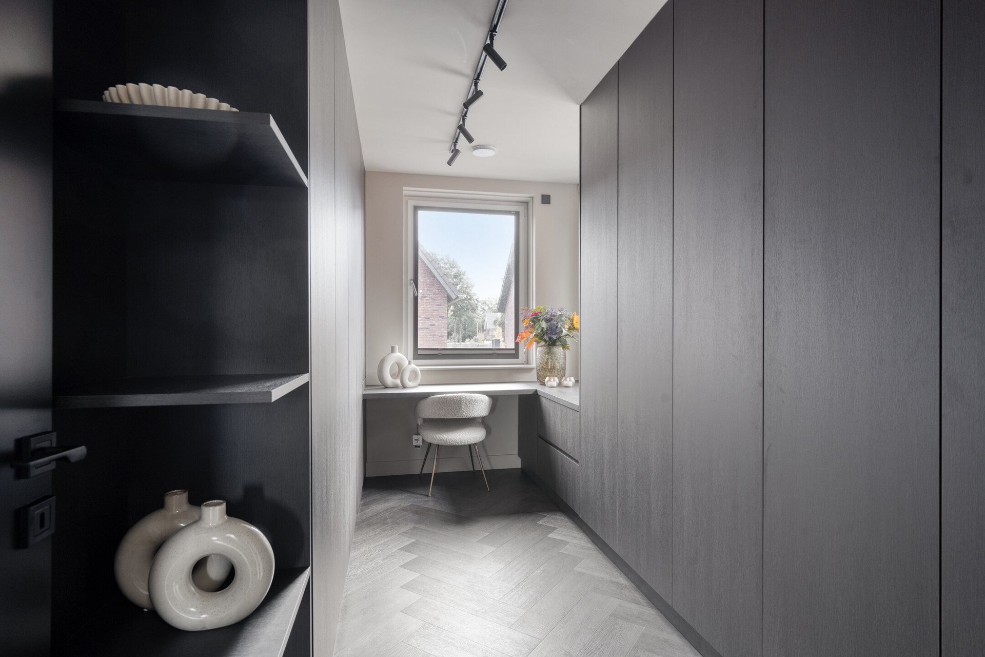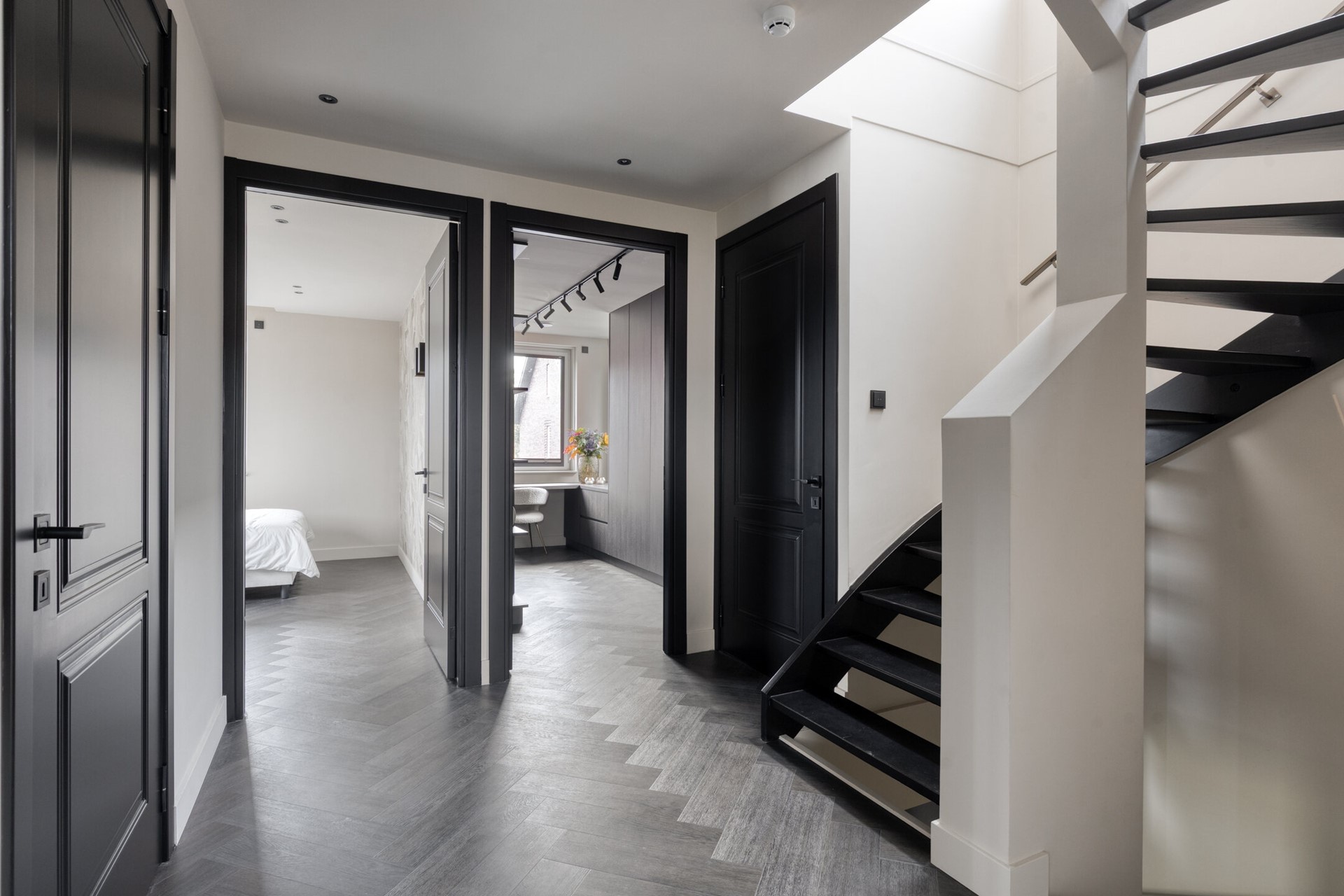 Via de vaste trap bereiken we de overloop van de eerste verdieping, waar direct duidelijk wordt dat de hoogwaardige afwerking van de begane grond hier naadloos wordt voortgezet. De combinatie van strakke lijnen, donkere accenten en de stijlvolle vloer zorgt voor een rustige en elegante uitstraling. Dankzij de aanwezige vloerverwarming én -koeling is het hier het hele jaar door aangenaam comfortabel. Vanaf de overloop heeft u toegang tot drie slaapkamers en de badkamer. De drie ruime slaapkamers zijn met zorg ingericht en voorzien van maatwerk kasten en geïntegreerde bureaus, waardoor functionaliteit en design hand in hand gaan. Daarnaast zijn deze kamers uitgerust met airconditioning en screens, zodat ook tijdens warme zomerdagen een optimaal binnenklimaat gegarandeerd is. De derde kamer is ingericht als stijlvolle walk-in-closet. Hier komt maatwerk volledig tot zijn recht: strak vormgegeven kastenwanden bieden volop opbergruimte en geven de ruimte een hotelwaardige sfeer. Uiteraard kan deze kamer desgewenst ook als slaapkamer of werkruimte worden gebruikt.