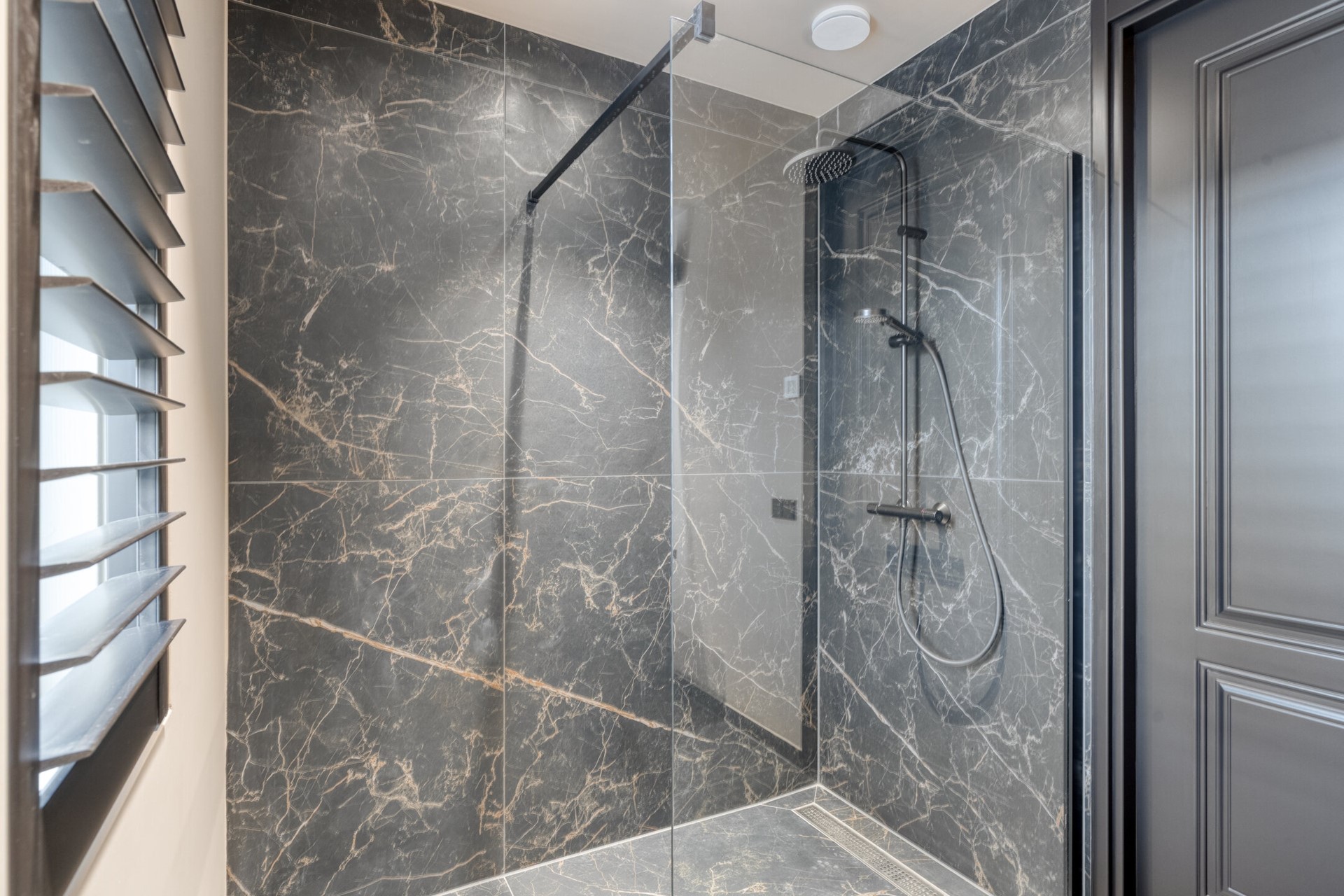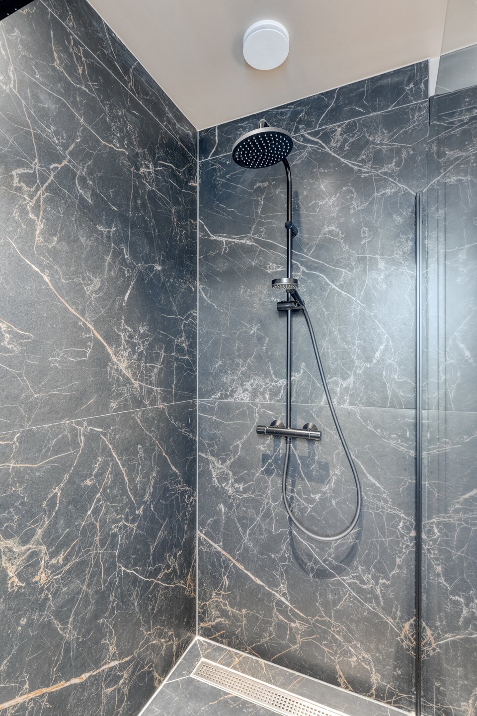 De badkamer vormt een waar wellnessmoment in huis. De ruimte is volledig betegeld met grote, luxe wand- en vloertegels. De royale inloopdouche met glazen wand en regendouche nodigt uit tot ontspannen. Het dubbele wastafelmeubel met spiegel biedt comfort en ruimte, terwijl de geïntegreerde Sonos speaker zorgt voor uw favoriete muziek tijdens de ochtendroutine of een ontspannen avond. Separaat van de badkamer bevindt zich een moderne toiletruimte met zwevend toilet, uitgevoerd in dezelfde hoogwaardige stijl als de rest van de verdieping.