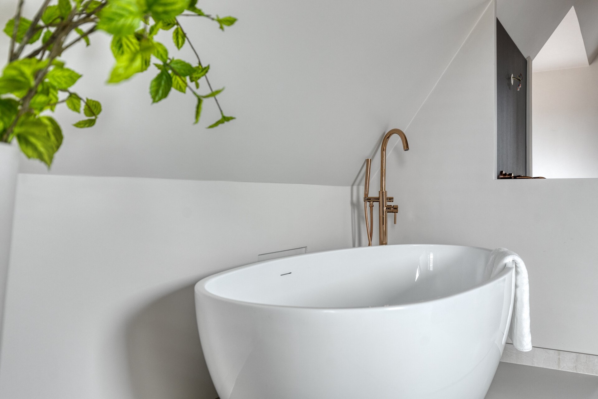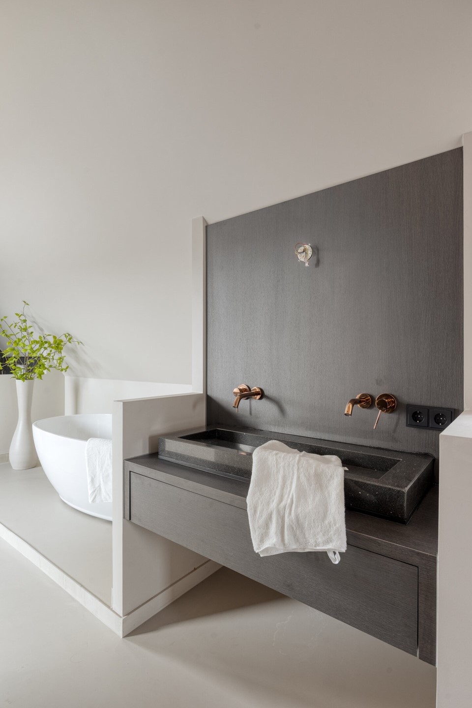 De tweede verdieping is ingericht als een volwaardig en luxe ouderverblijf. Hier gaan slapen en ontspannen moeiteloos in elkaar over. De ruime slaapkamer onder de kap heeft een rustige uitstraling en wordt prachtig verlicht door de aanwezige ramen. Aansluitend bevindt zich de open wellnessruimte met een vrijstaand bad als stijlvol middelpunt, een inloopdouche met luxe afwerking, een dubbele wastafel en een toilet. De combinatie van lichte tinten met donkere marmerlook accenten en warm koperkleurig sanitair geeft het geheel een krachtige en elegante sfeer. Bovendien is er een voorbereiding getroffen voor het plaatsen van een sauna, zodat u hier eenvoudig uw eigen spa kunt realiseren.