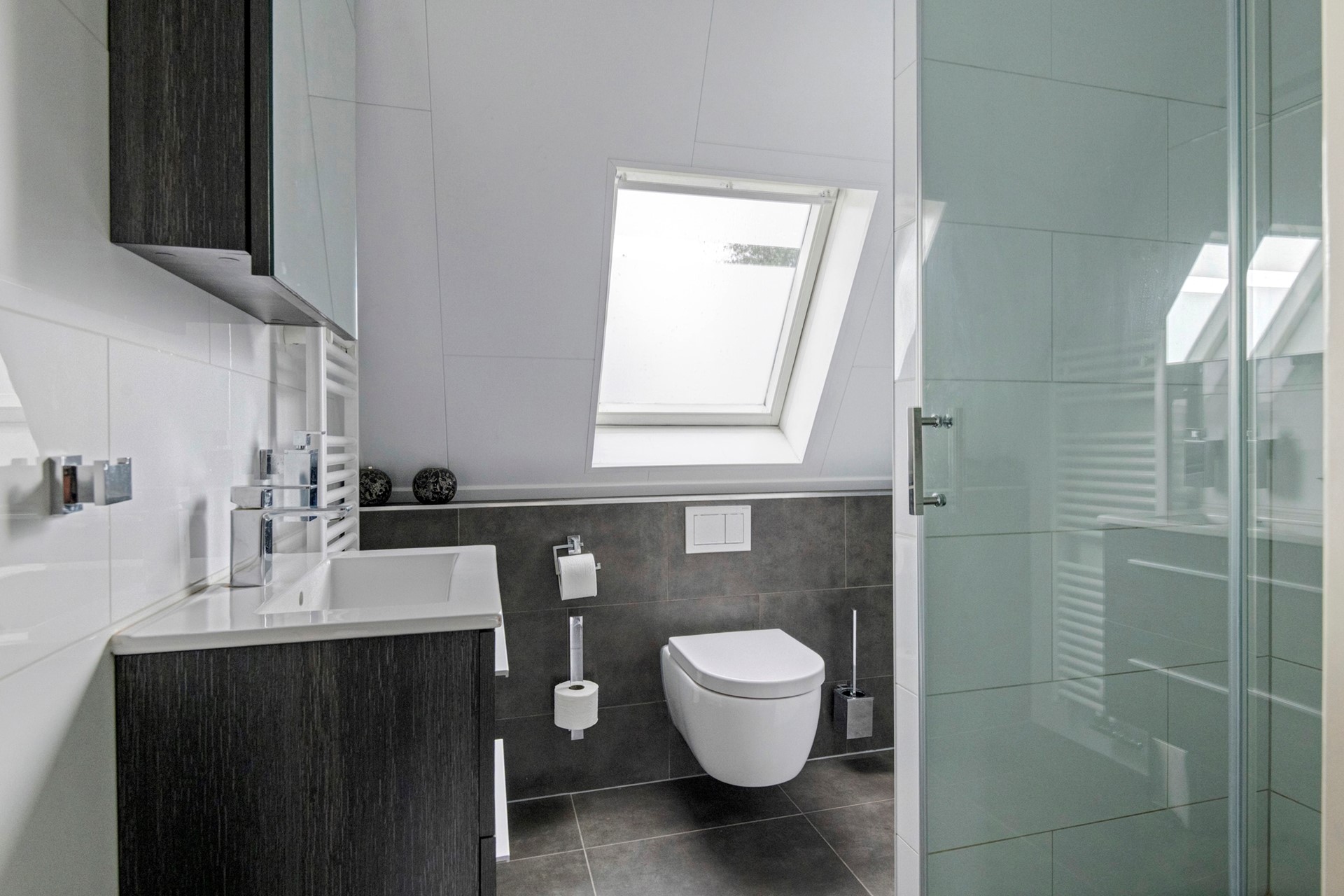 De badkamer is luxe uitgevoerd in een wit/grijze kleurstelling en biedt een regendouche, een zwevend toilet, designradiator, een wastafel in meubel.