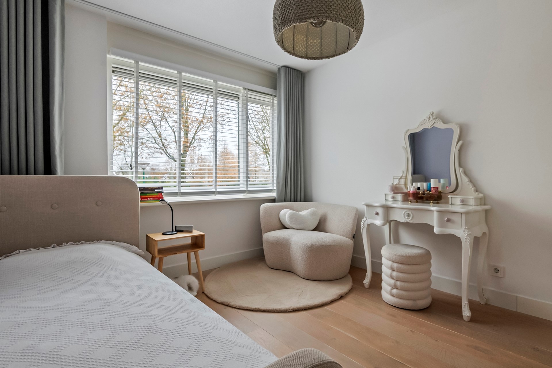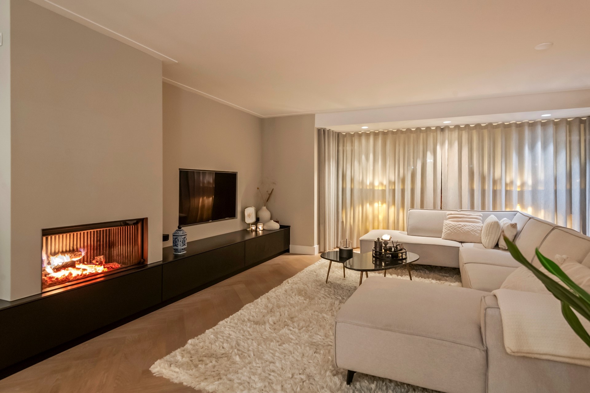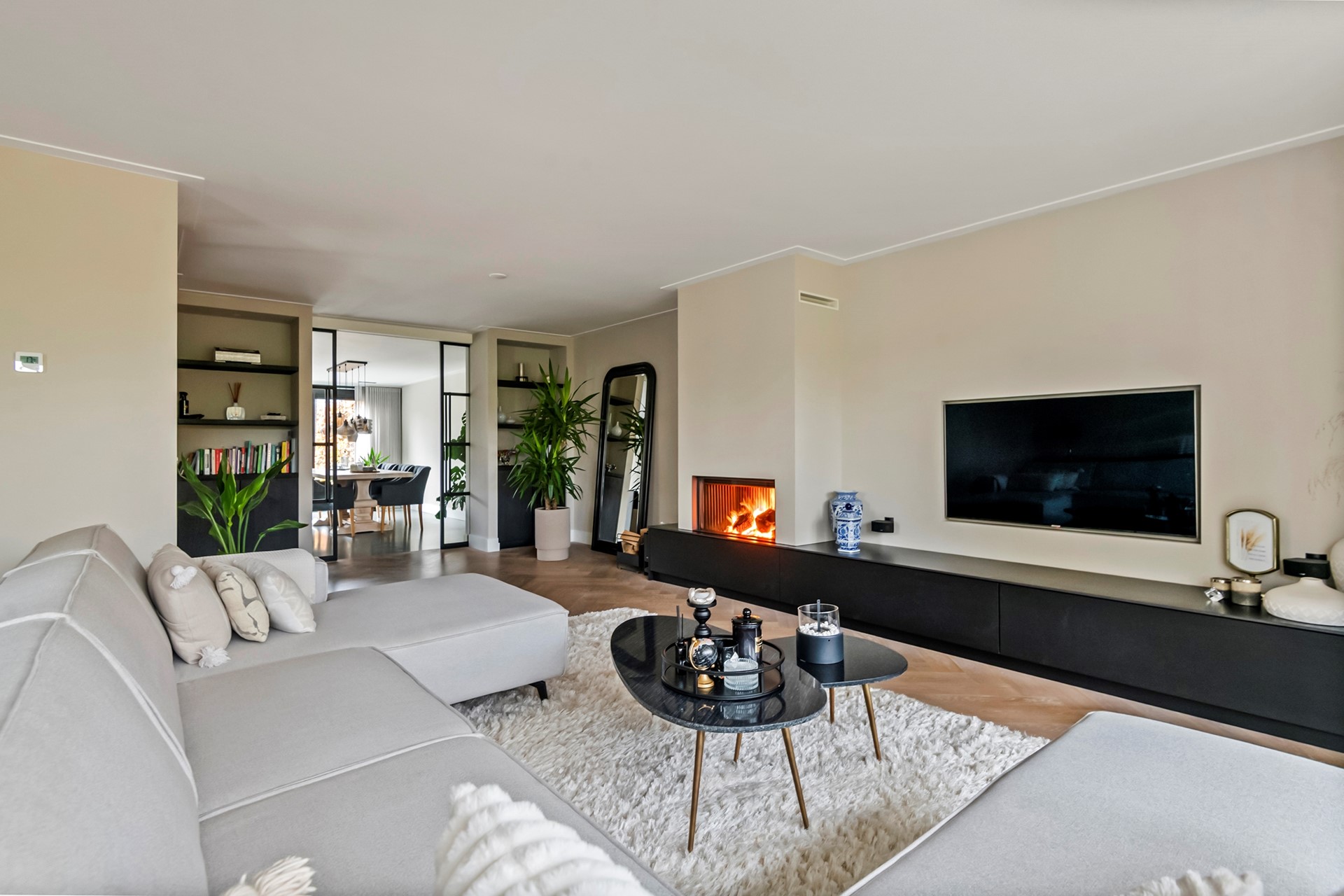 Binnen stap je in een stijlvol en licht interieur met een hoog afwerkingsniveau. De ruime woonkamer is voorzien van een prachtige visgraatvloer, een sfeervolle open haard en een karakteristieke erker die voor extra lichtinval en ruimtegevoel zorgt.