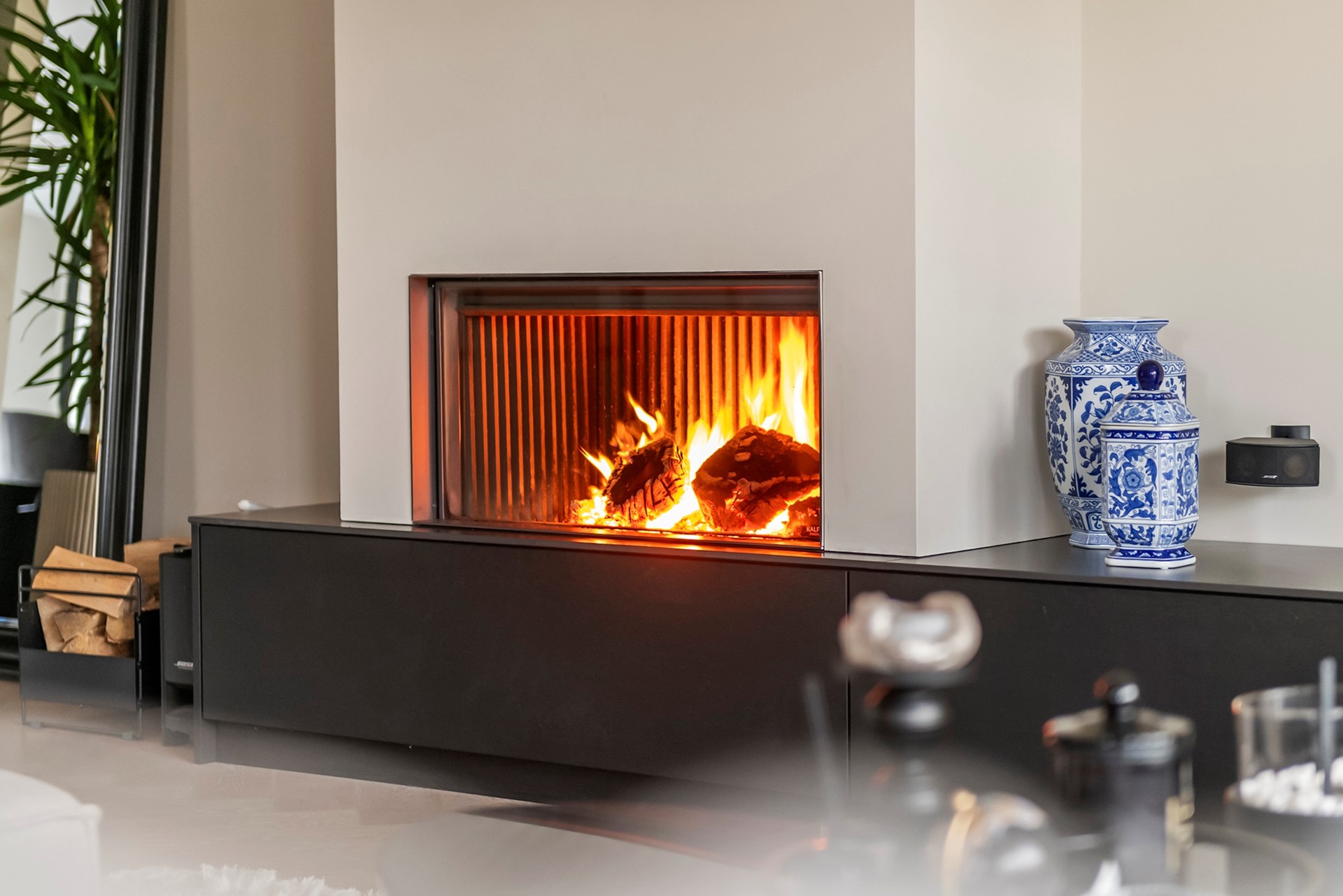 De woonkamer is voorzien van een prachtige visgraatvloer, serene kleurtinten en een ruime erker die zorgt voor veel lichtinval, daarnaast is er nog een sfeervolle openhaard aanwezig. De fraaie stalen deuren scheiden de living van de woonkeuken.