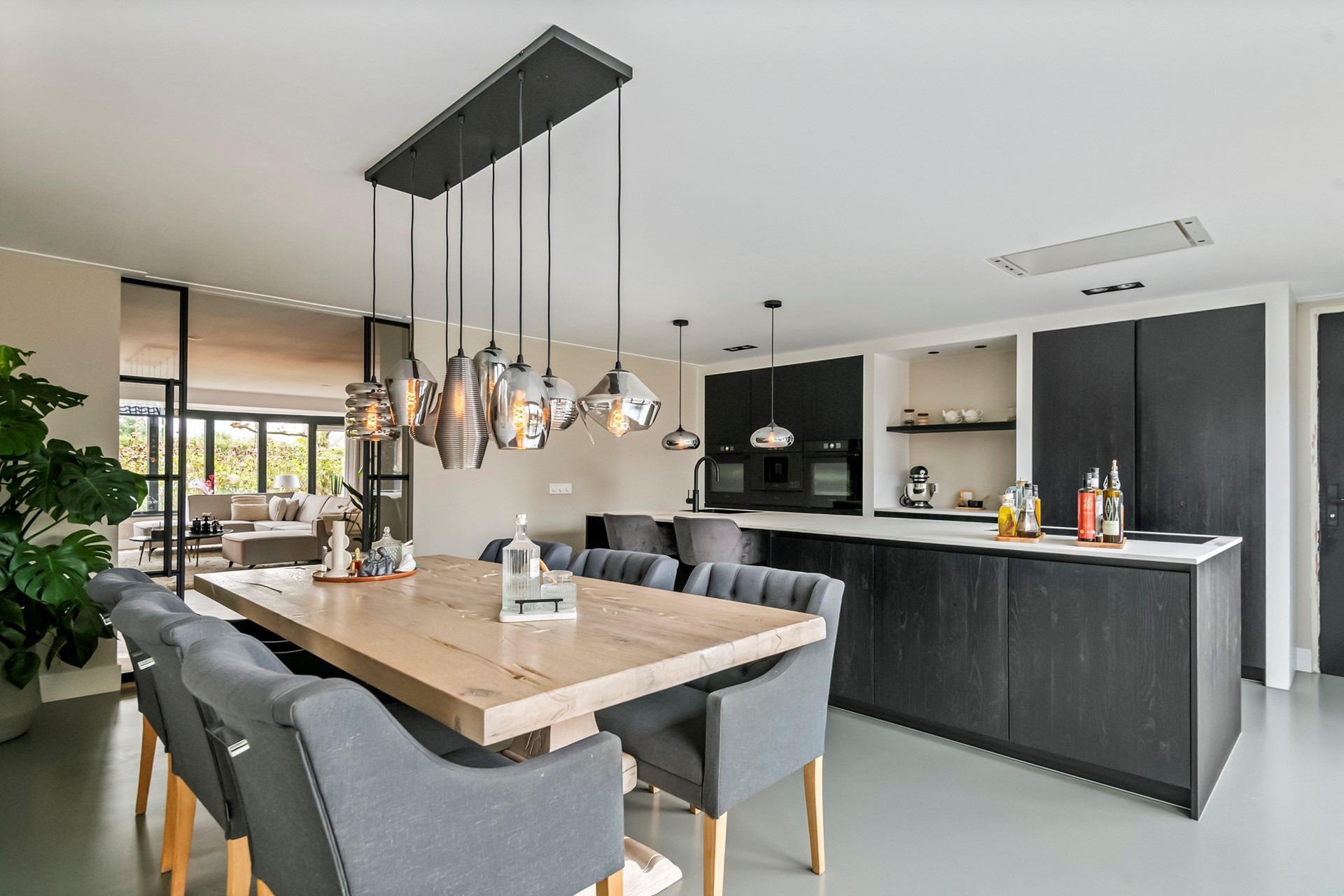 Bij deze imposante leefkeuken is er meer dan voldoende ruimte voor uw eethoekopstelling. Het hart van de woning welke zich leent voor fantastische diners, gezellige borrels en lekkere ontbijtjes/brunches met uw gezin. Het kookeiland (met ontbijtbar) en de rechte wandopstelling zijn zeer compleet qua apparatuur, denk daarbij aan een inductiekookplaat met een afzuiging in het plafond geïnstalleerd, twee (combi/stoom)ovens, koffiezetapparaat en o.a. een ‘Quooker’ kraan. Alles geplaatst in een zeer riante opstelling.