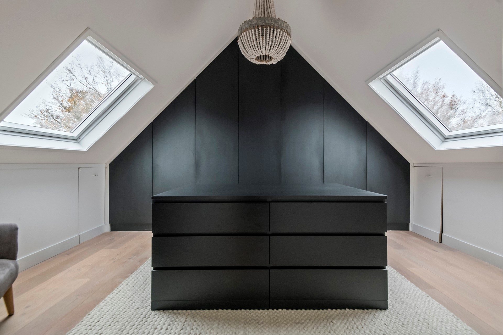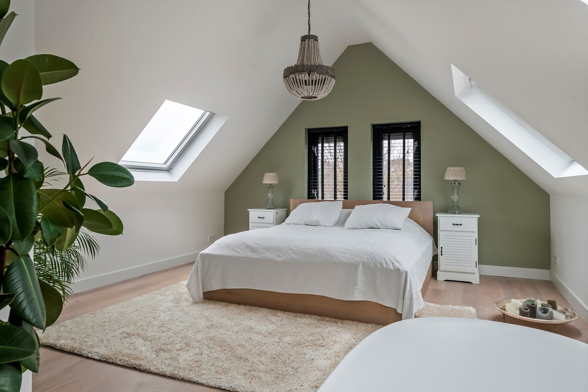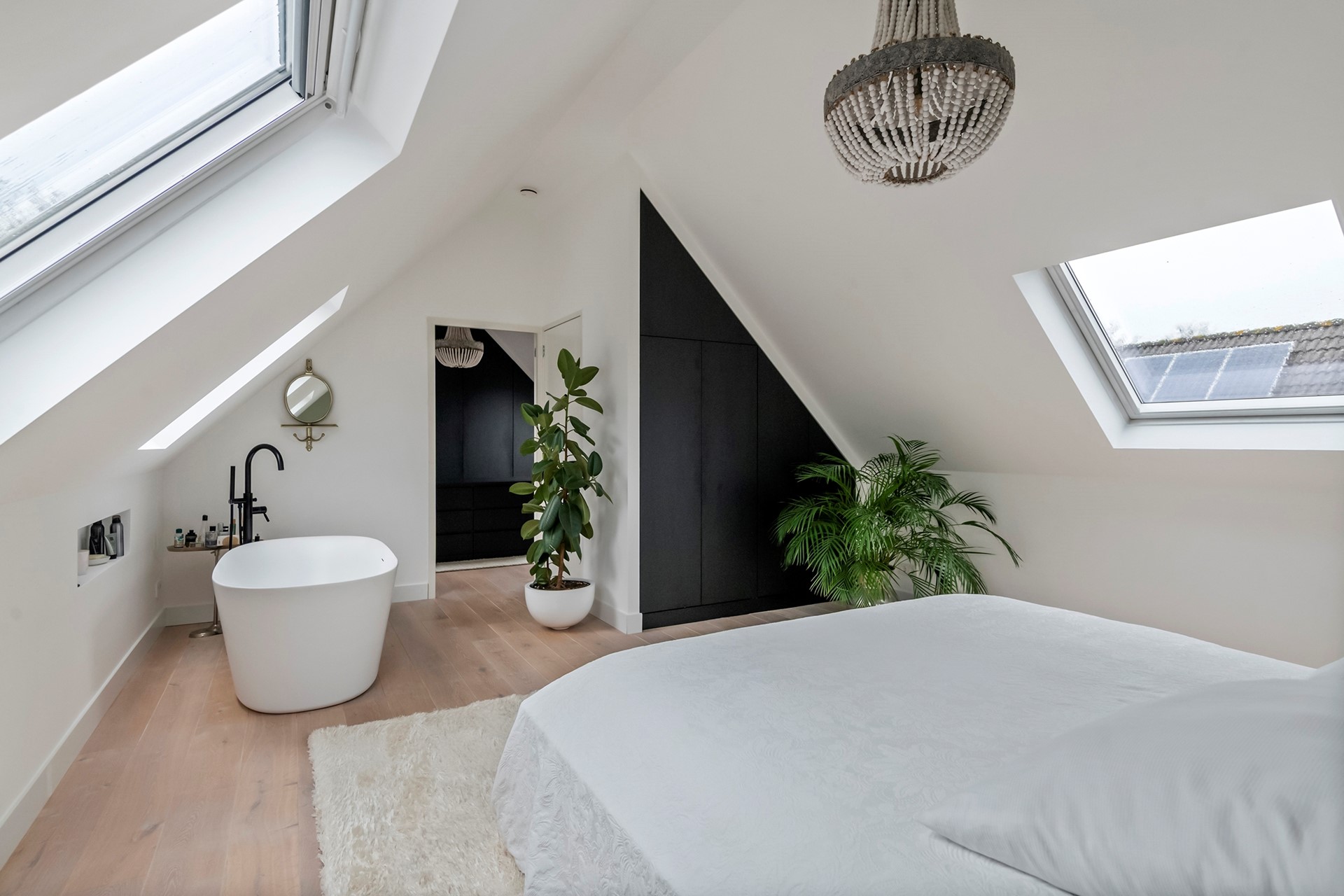 De tweede verdieping is een echte luxe retreat en momenteel ingericht als masterbedroom. Dankzij de hoge nok voelt de ruimte bijzonder ruim en sfeervol aan. Een vrijstaand ligbad geeft deze verdieping bovendien een exclusieve, suitesfeer zoals in een luxe hotel. Daarnaast is er een praktische walk-in-closet aanwezig.