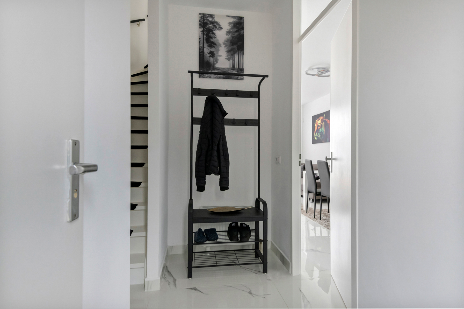 Via de voortuin komen we binnen via de entree, in de ontvangsthal met aldaar de toiletruimte, de meterkast, trapopgang naar de eerste verdieping en de doorgang naar de woonkamer.