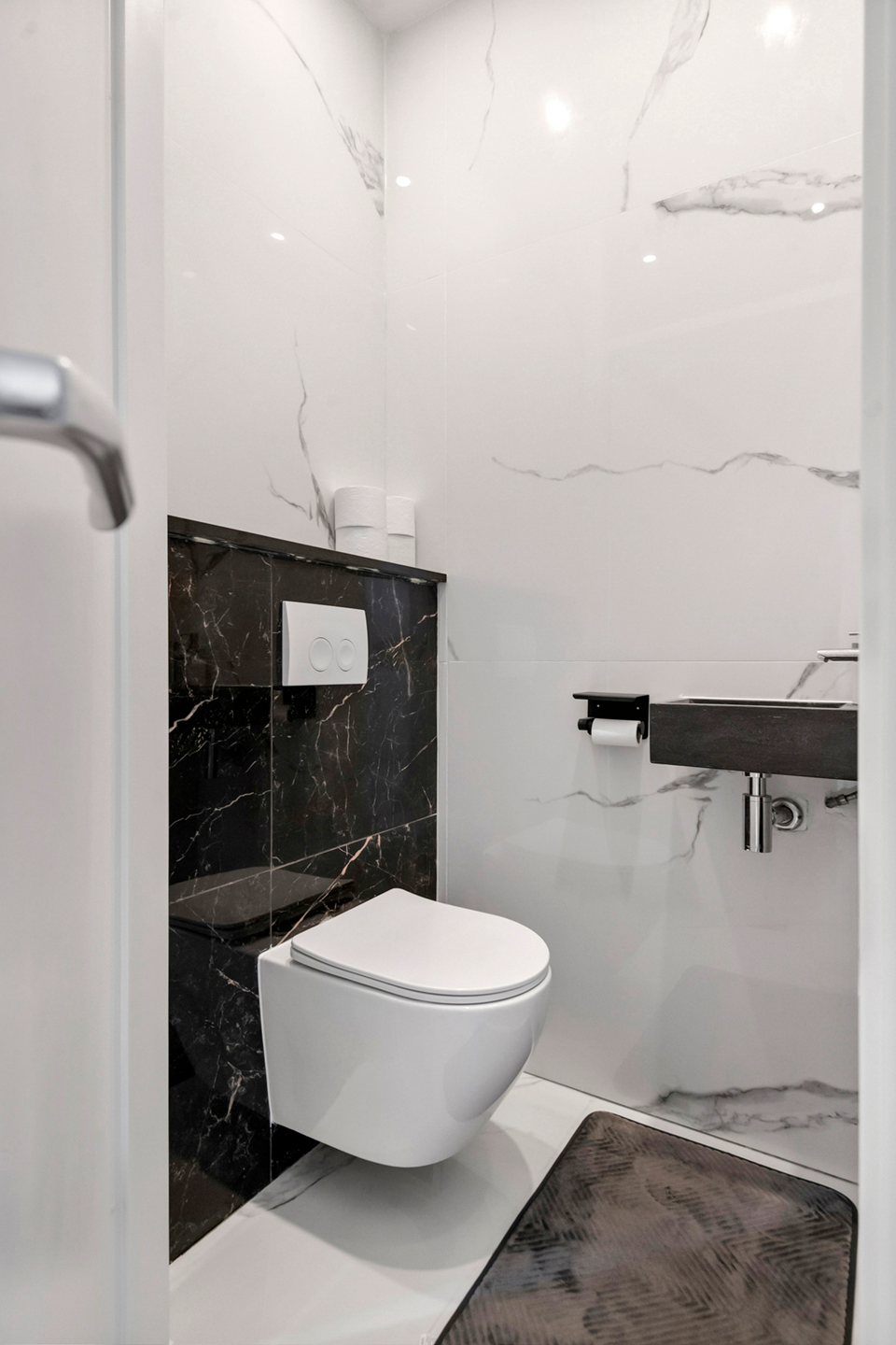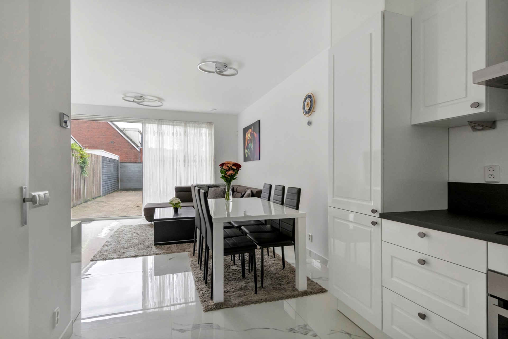 De begane grond is voorzien van een strakke Statuario vloertegel. De tuingerichte woonkamer is licht en voorzien van een schuifpui naar de achtertuin. Tussen de keuken en de zithoek is ruimschoots plek voor een eettafel; ideaal voor lange diners of huiswerk aan tafel.