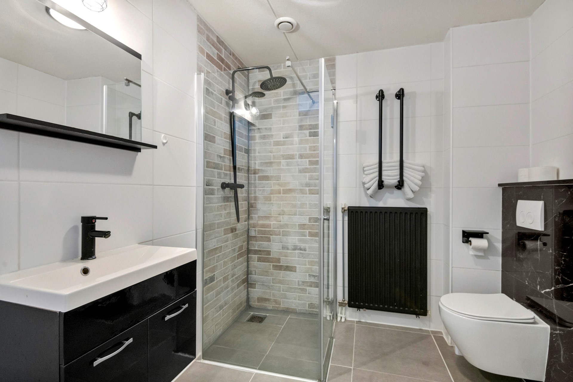De nette badkamer beschikt over een inloopdouche, een radiator, een toilet en een wastafel met meubel en spiegel.