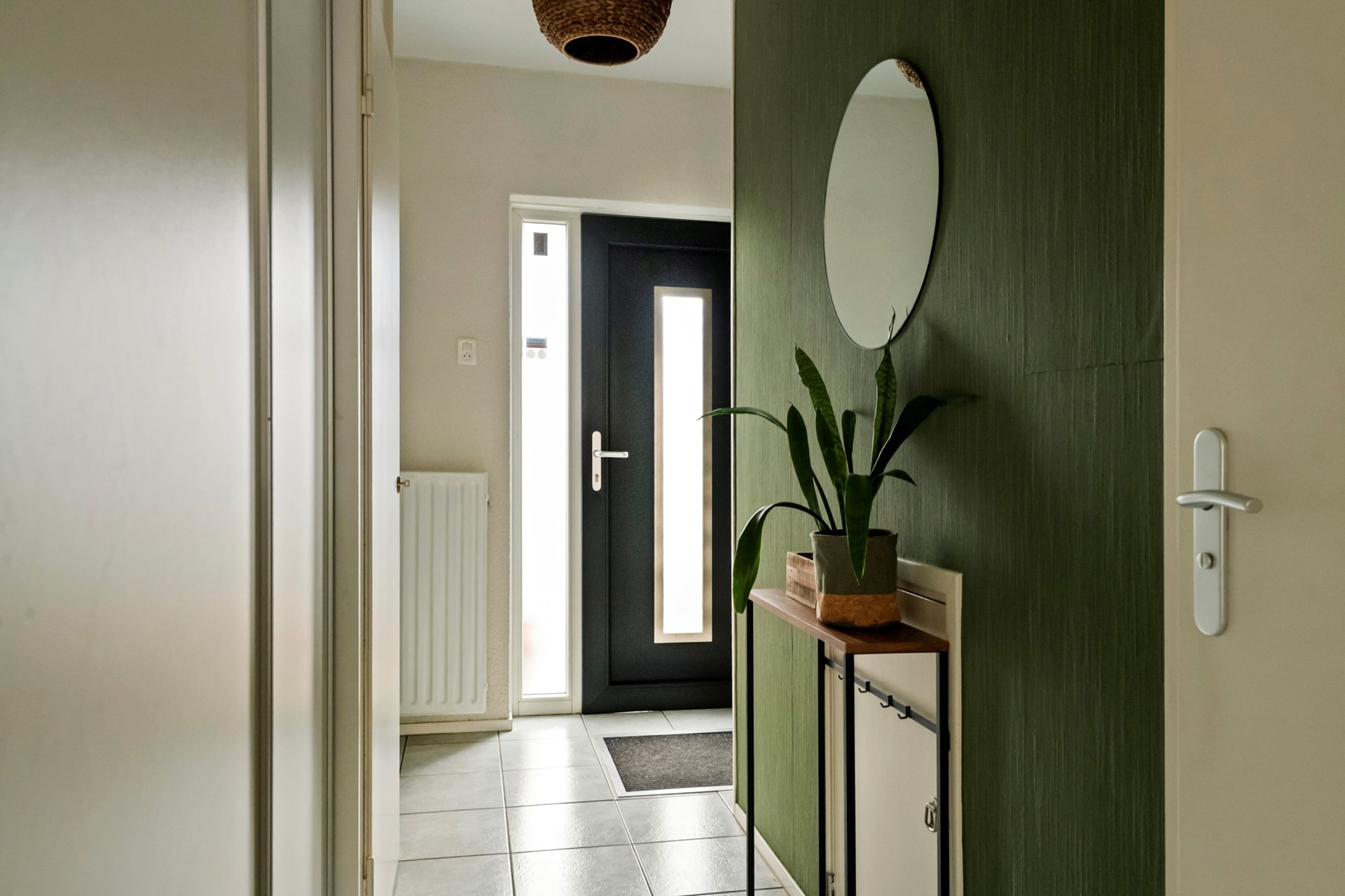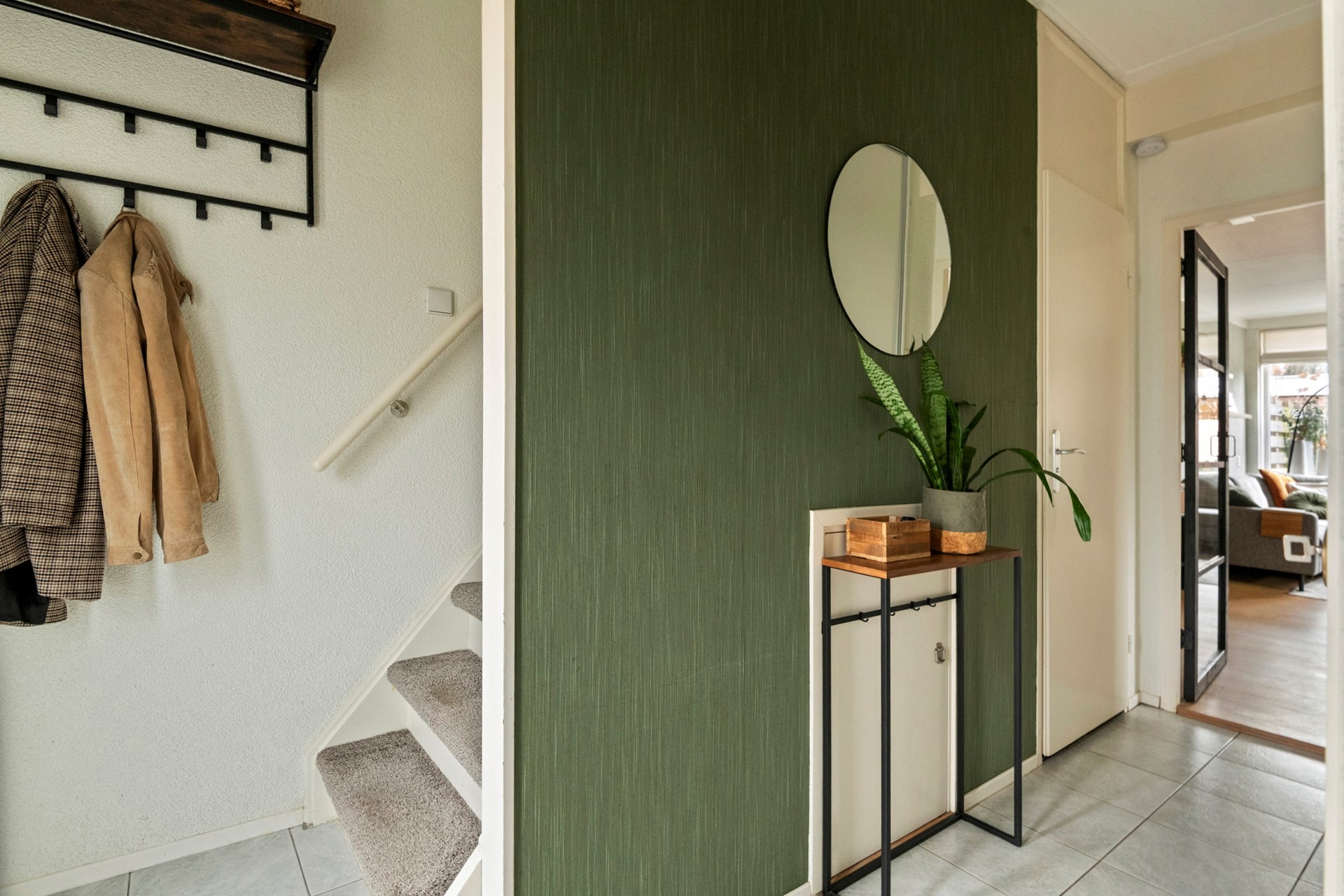 In de hal is bovendien een praktische vaste schuifwand geplaatst. Achter deze schuifwand vind je extra bergruimte en de aansluiting voor de wasmachine.