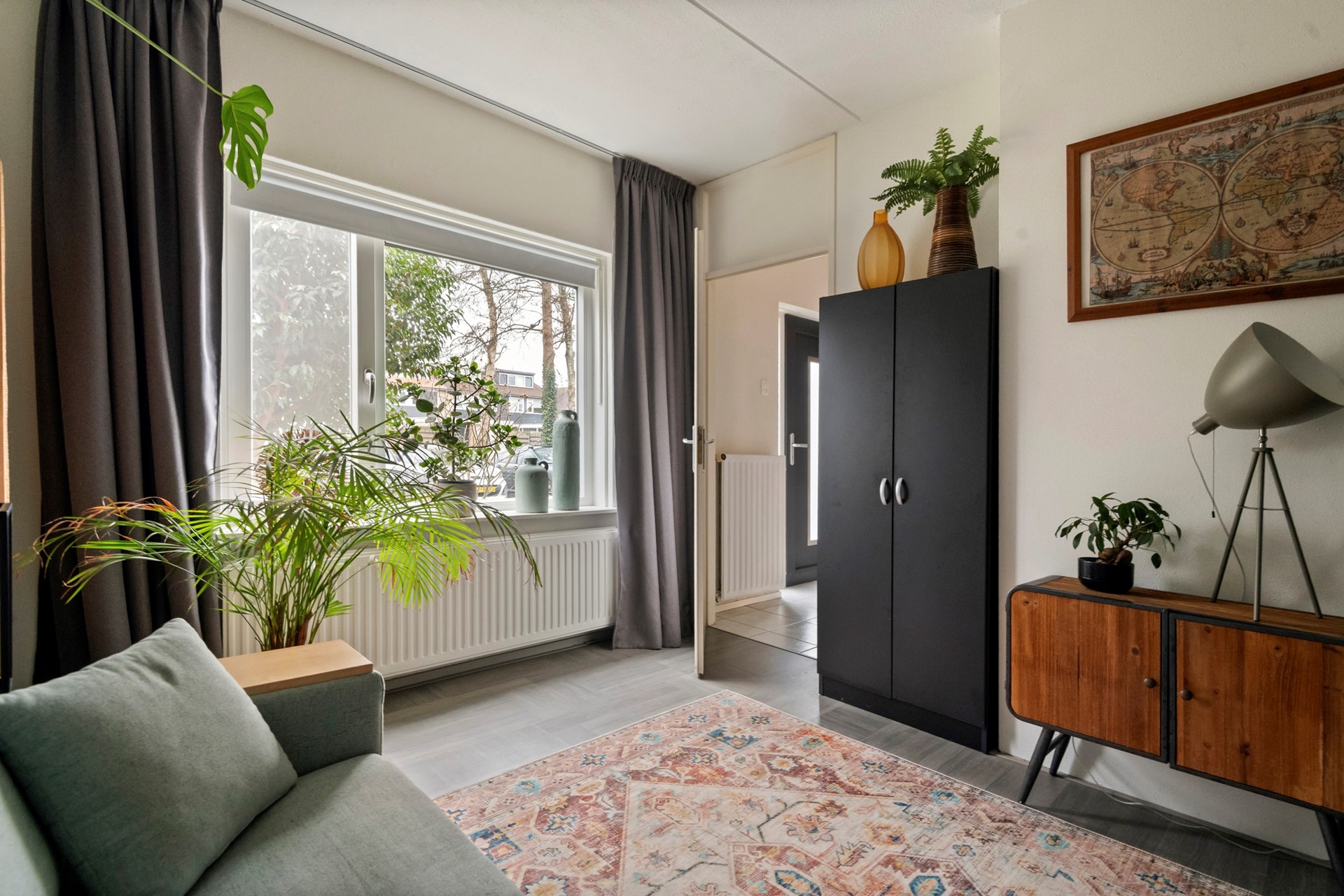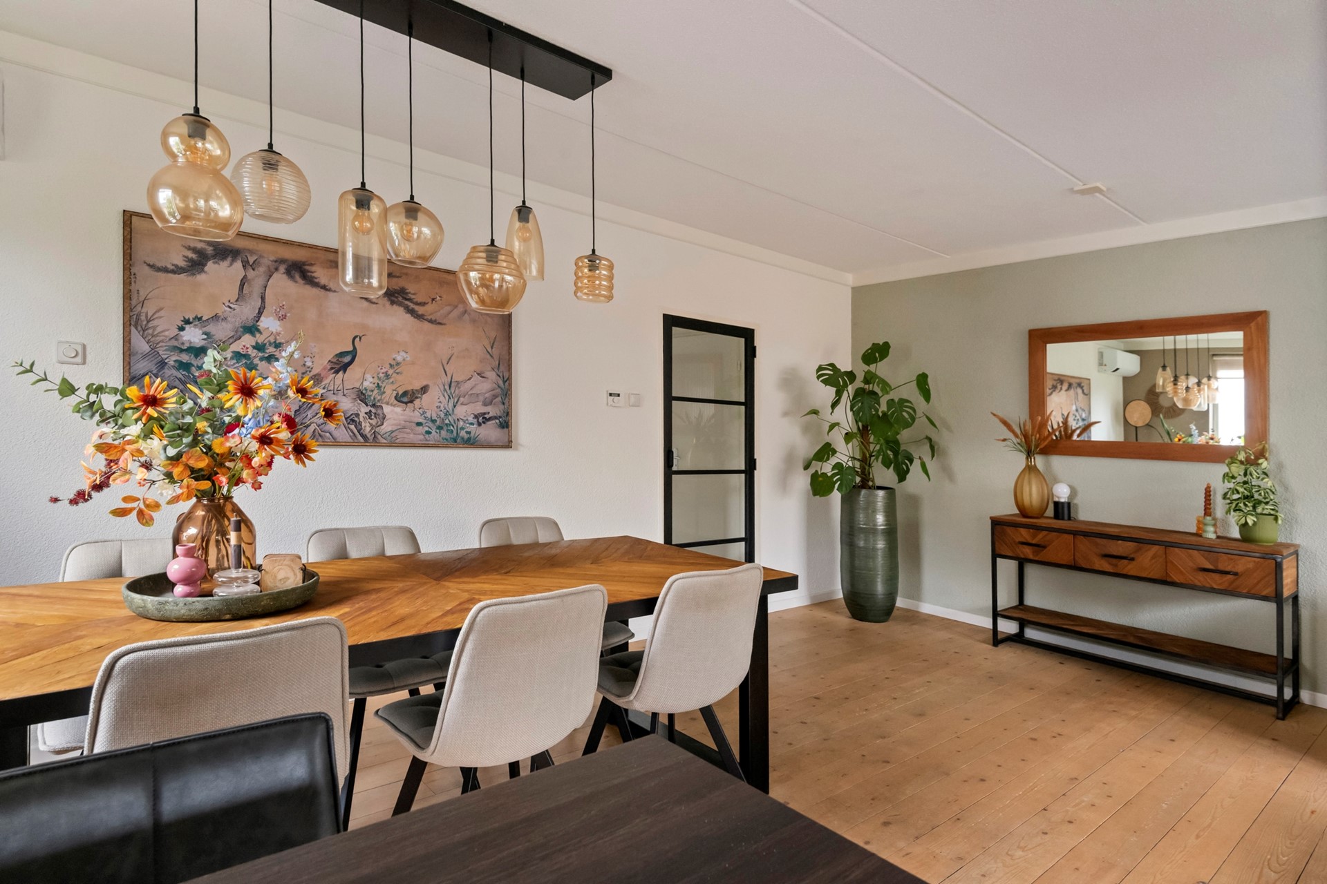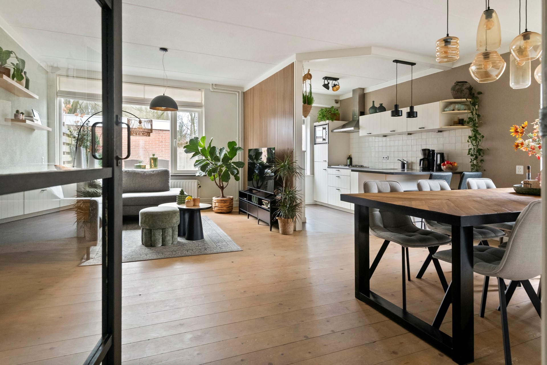 Vanuit de hal loop je door naar de ruime woonkamer, een comfortabele en gezellige leefruimte met volop mogelijkheden voor een fijne zithoek. Dankzij de prettige indeling is er daarnaast meer dan genoeg ruimte voor een royale eethoekopstelling, ideaal voor lange diners of gezellig tafelen met familie en vrienden. Tevens is de woonkamer voorzien van airconditioning (2025).