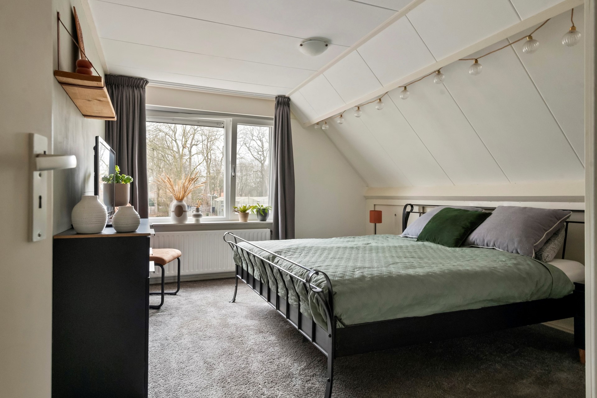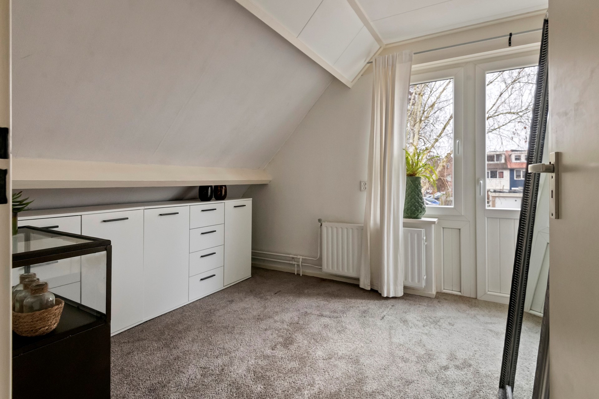De tweede slaapkamer ligt aan de voorzijde, is eveneens prettig van formaat en heeft als leuk detail een Frans balkon.