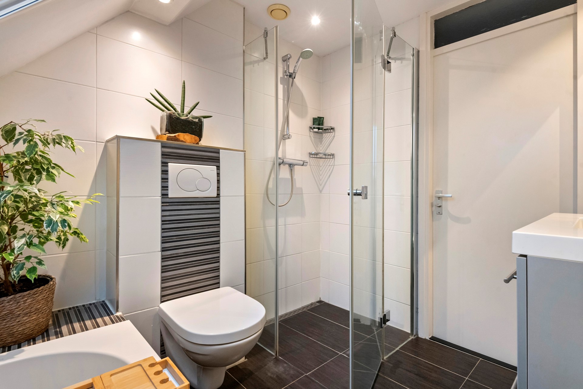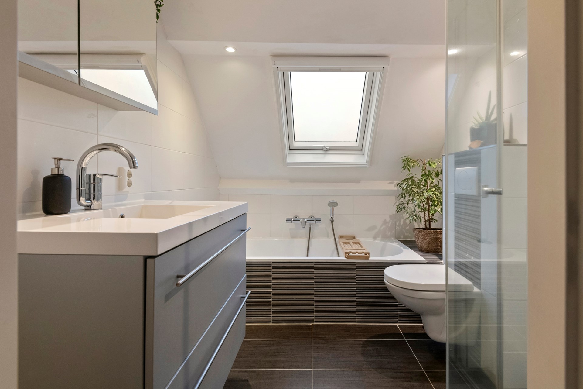 Vervolgens lopen we door naar de badkamer. Een heerlijk verblijf met de luxe van een ligbad. Fijn detail is hier het Velux dakraam, dat zorgt voor een goede ventilatie en fijne lichtinval. De badkamer is tevens voorzien van een toilet, douchegelegenheid en wastafel in een meubel.