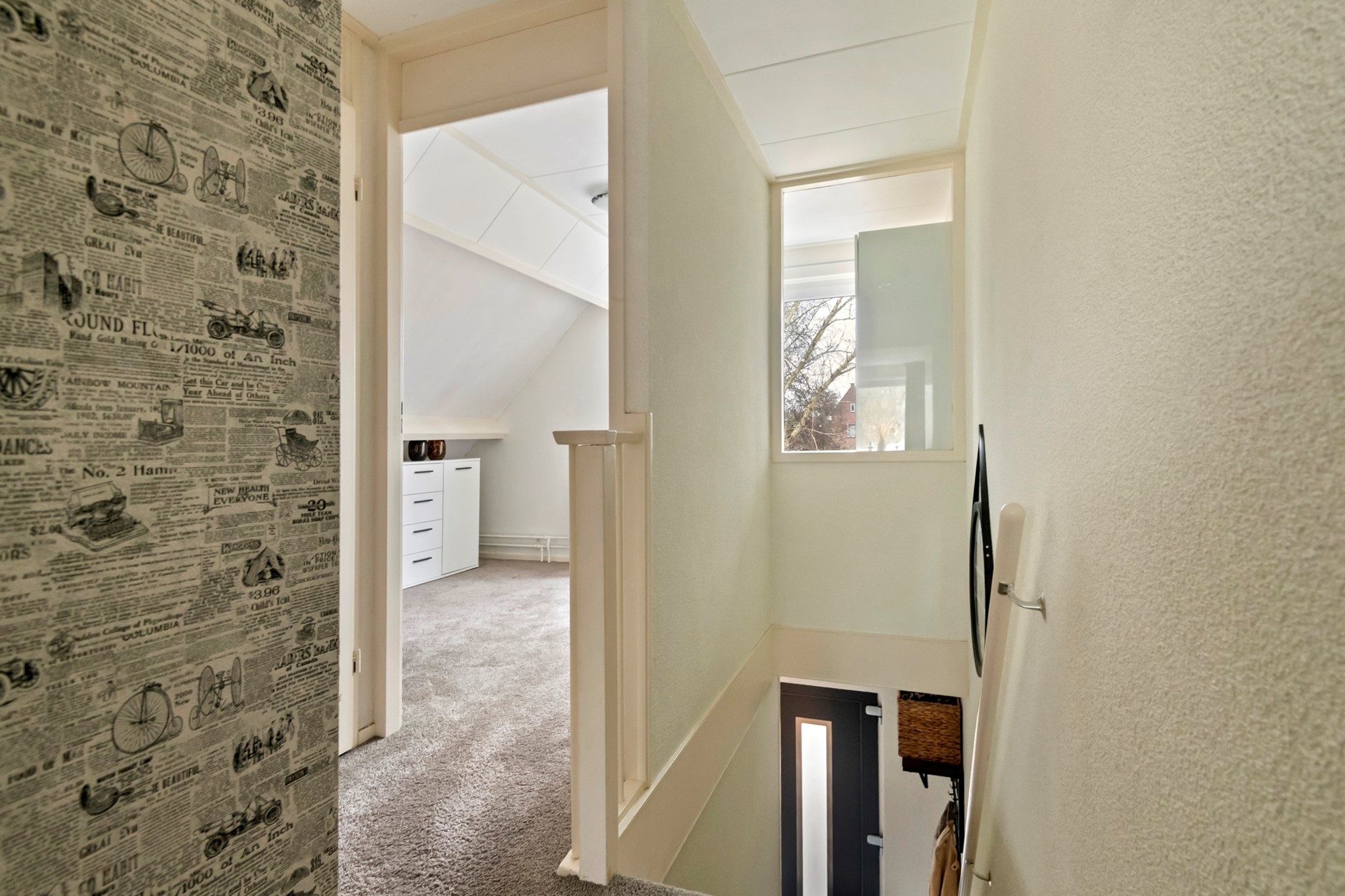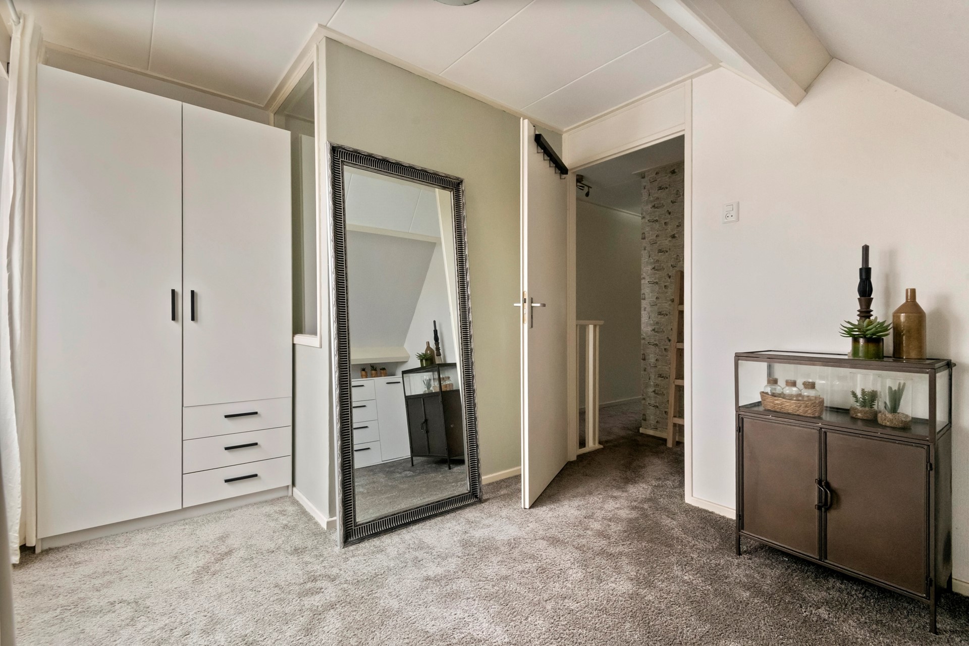De gehele eerste verdieping is afgewerkt met vloerbedekking. Op de overloop bevindt zich tot slot een vaste kast met de cv-opstelling (Nefit Ecomline 22HRC 2000) en extra opbergruimte.