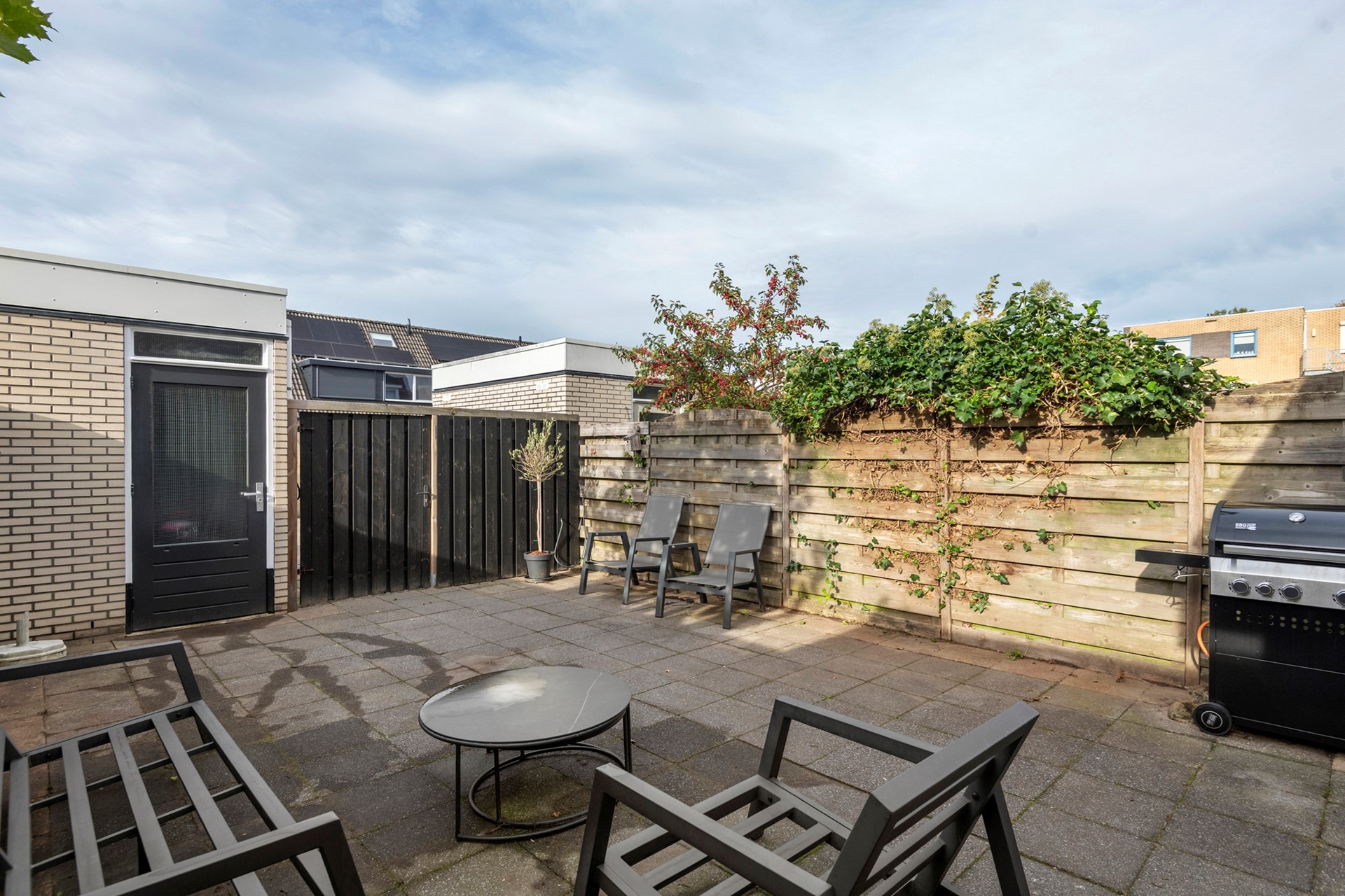 De onderhoudsarme achtertuin ligt op het noordwesten en biedt een zonnige plek in de namiddag en avond. Er is een royale berging voor fietsen, gereedschap en opslag. Via de poort heb je toegang tot de achterom, waar je je auto eenvoudig op eigen terrein parkeert, direct achter de woning.