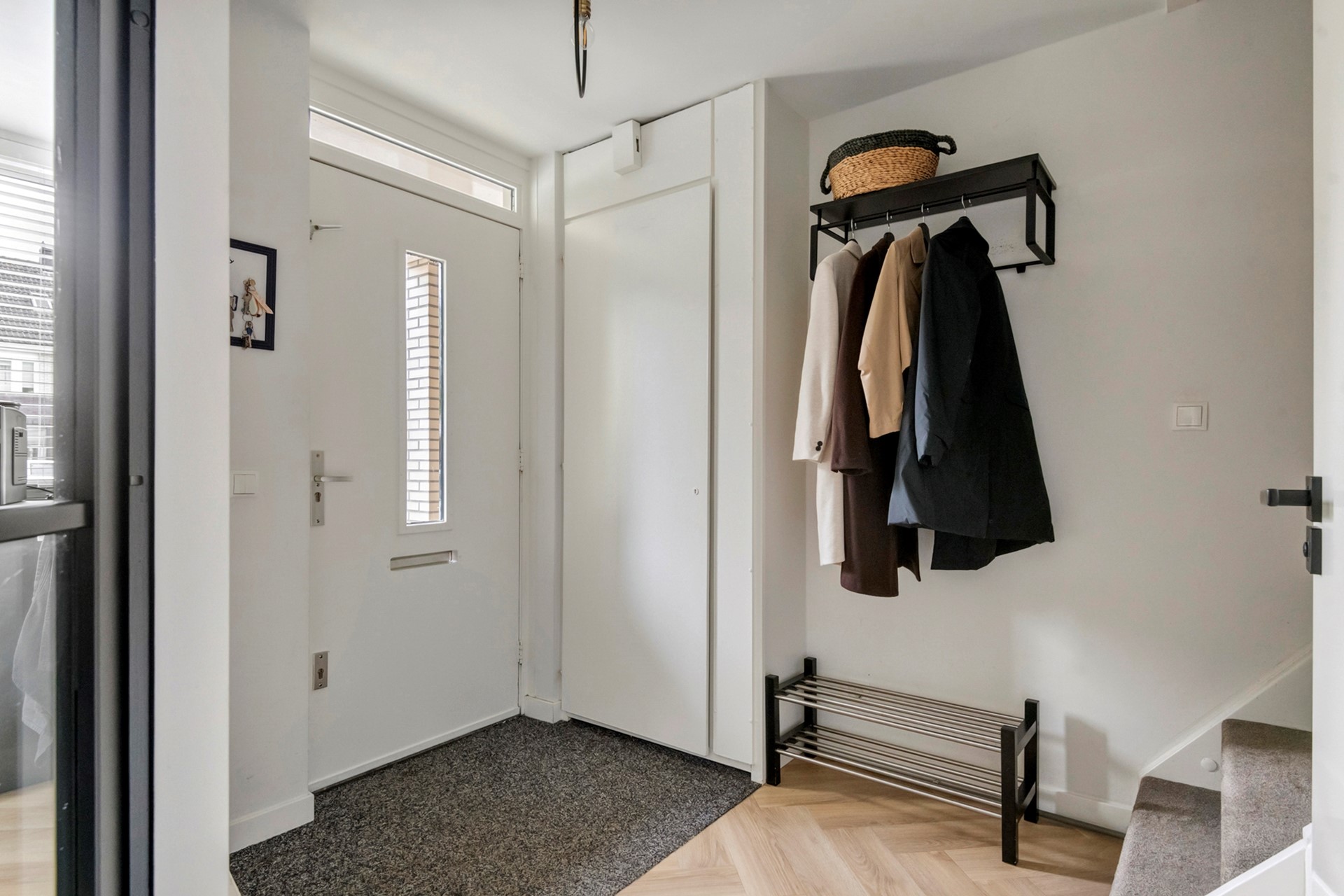 Via de voortuin komen we binnen in de hal. De hal is voorzien van een meterkast, toiletruimte, garderobe, trapopgang naar de eerste verdieping en de deur naar de living.