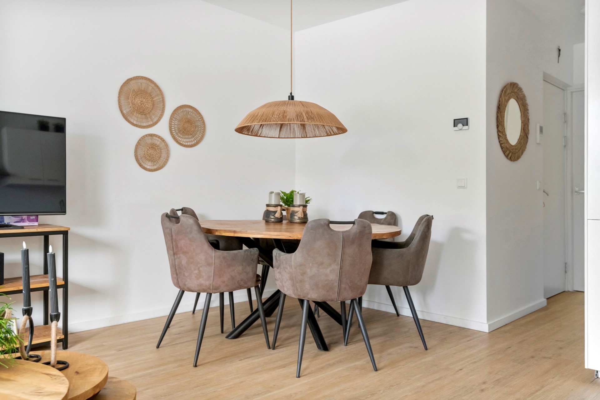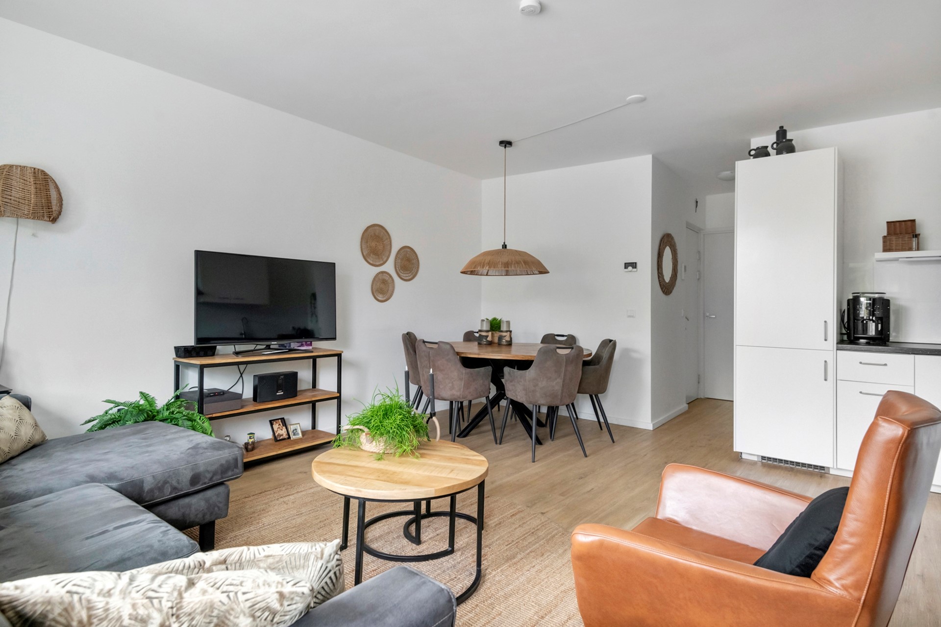 De woonkamer is een prettige en lichte ruimte, waar de open keuken op aansluit. De keuken is uitgevoerd met strakke witte kasten en een zwart werkblad en is voorzien van diverse inbouwapparatuur, waaronder een koelkast, vriezer, oven, vaatwasser, inductiekookplaat en afzuigkap.