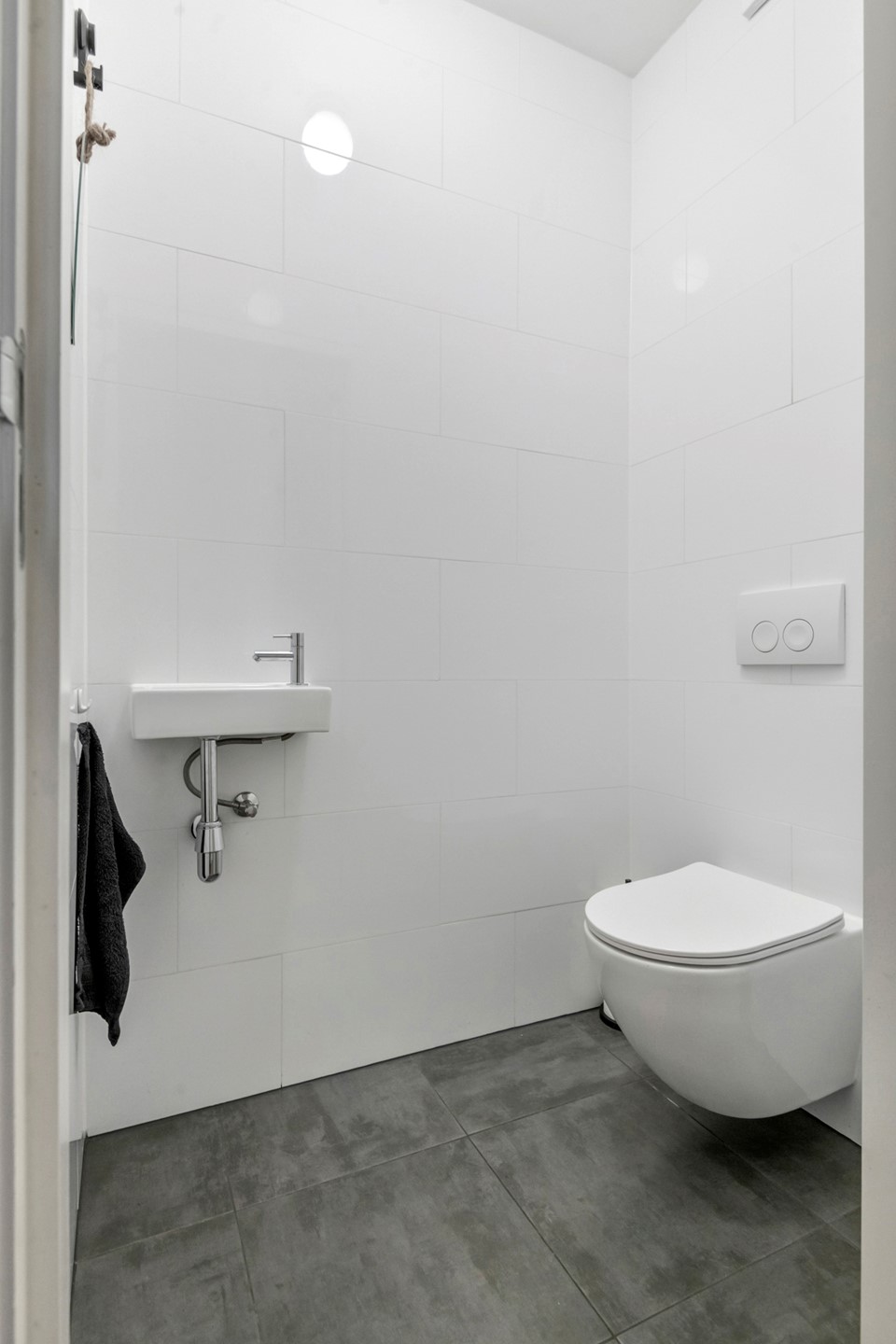 De badkamer is modern ingericht en voorzien van een ruime inloopdouche, een wastafelmeubel en een designradiator. Het separate toilet is eveneens netjes afgewerkt en voorzien van een fonteintje.
