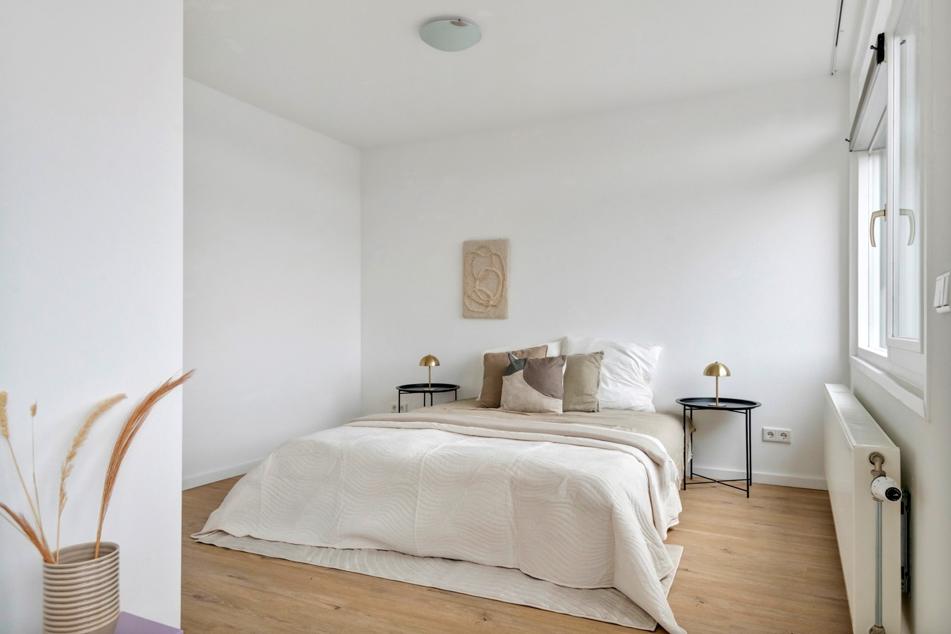 De slaapkamer ligt aan de rustige achterzijde en biedt ruimte voor een comfortabel tweepersoonsbed.