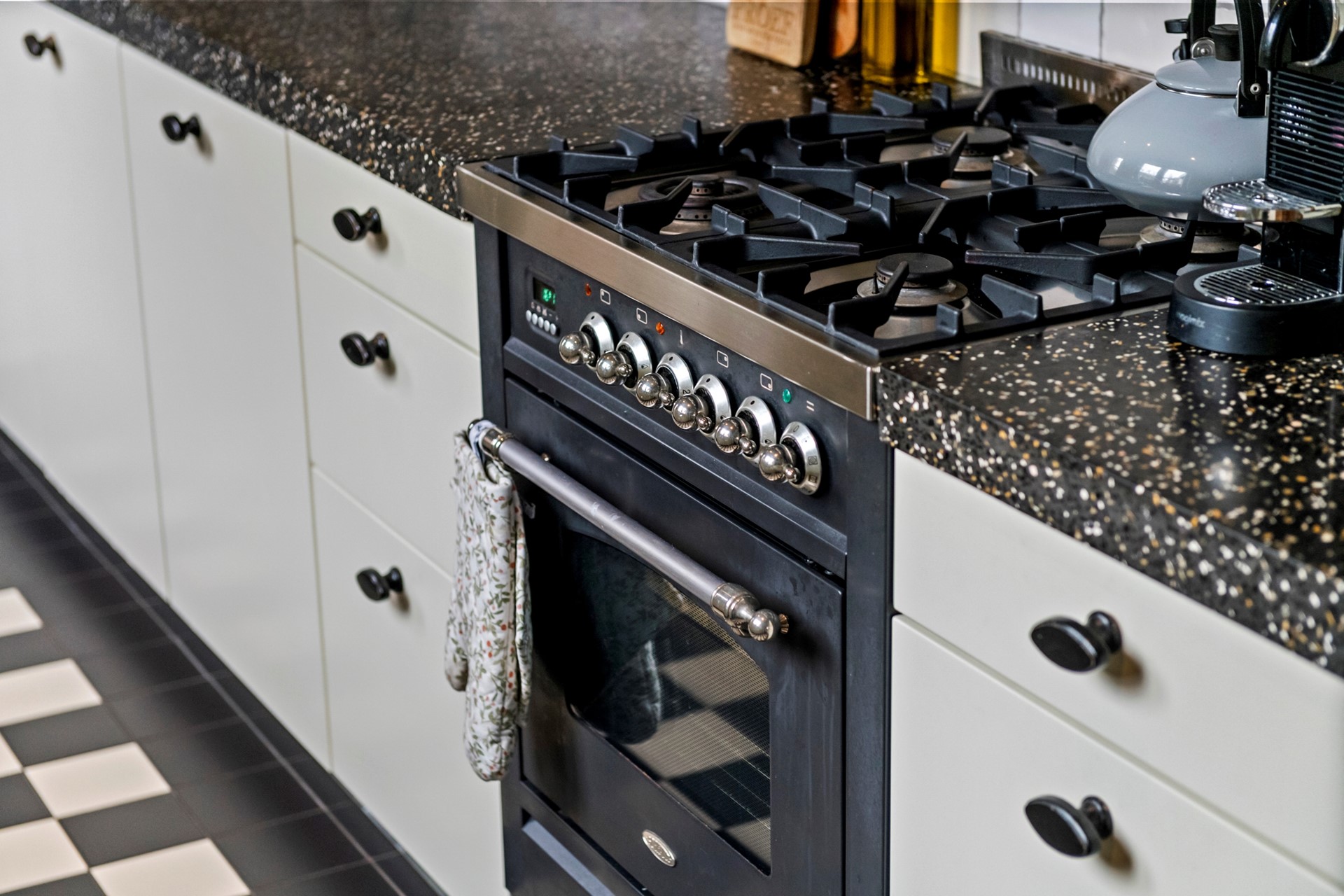 Aan de achterzijde van de woning bevindt zich de verzorgde, afgesloten keuken. Deze is praktisch ingericht met een strakke, rechte opstelling en onder- en bovenkasten in een lichte kleurstelling. De keuken is compleet uitgevoerd met een vrijstaand Boretti-fornuis met oven en vier gaspitten, een afzuigkap, vaatwasser en een koelkast met vriesvak.