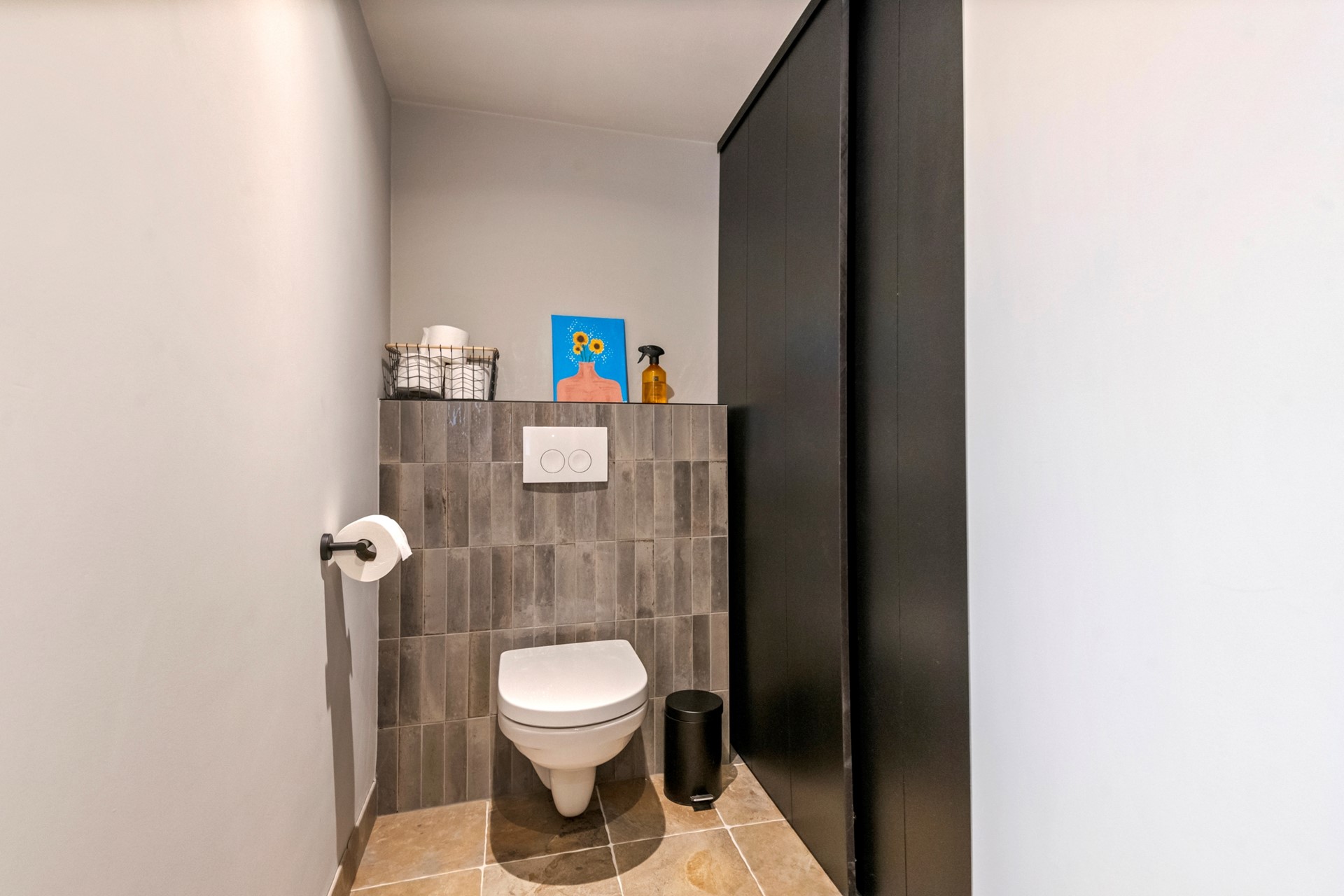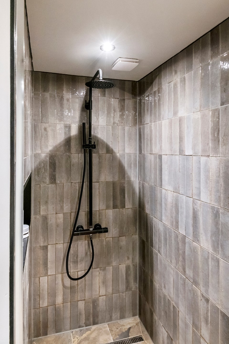 De moderne badkamer is strak afgewerkt in neutrale tinten en voorzien van inbouwspots. U beschikt hier over een ruime inloopdouche met regendouche en zwarte armaturen en een houten wastafelmeubel.